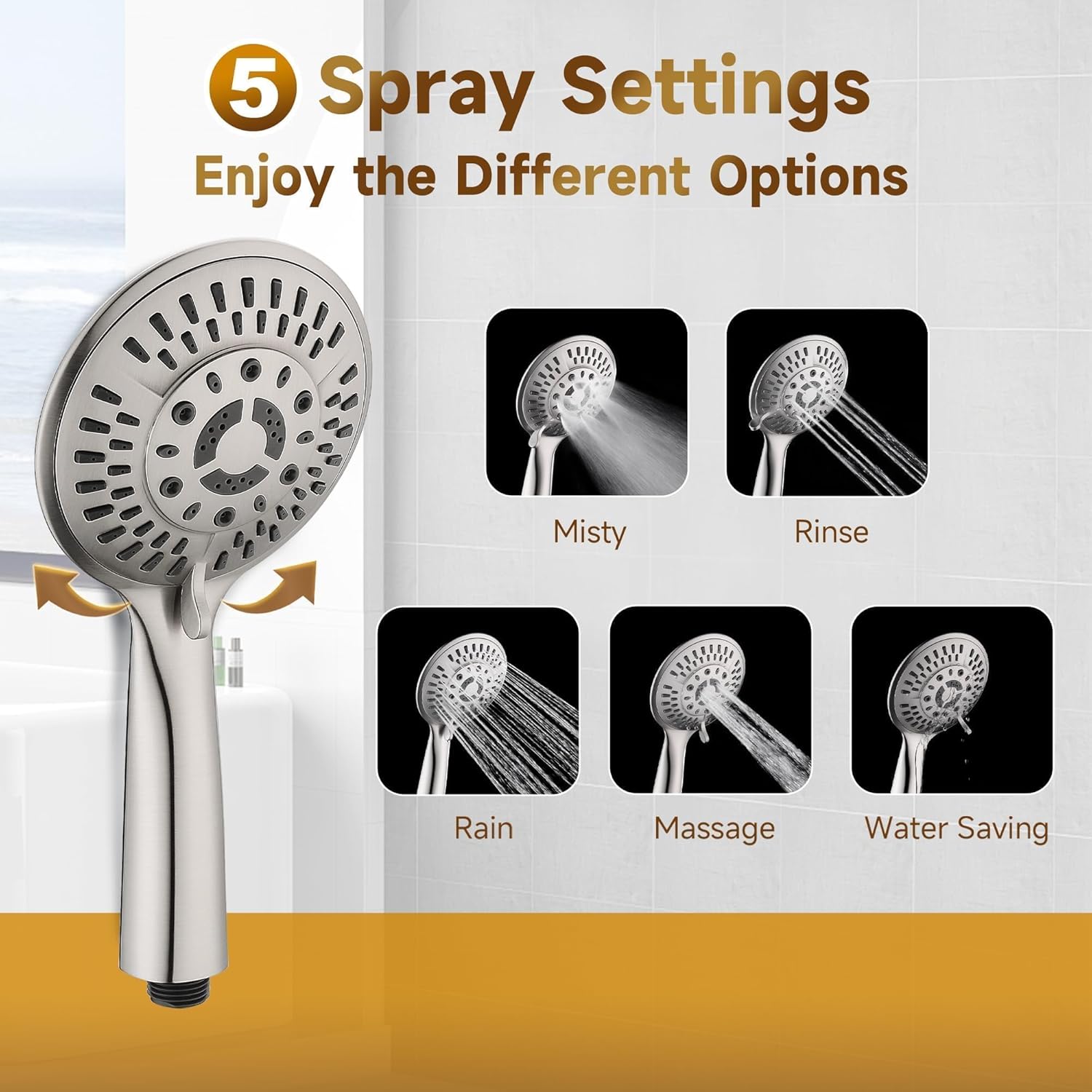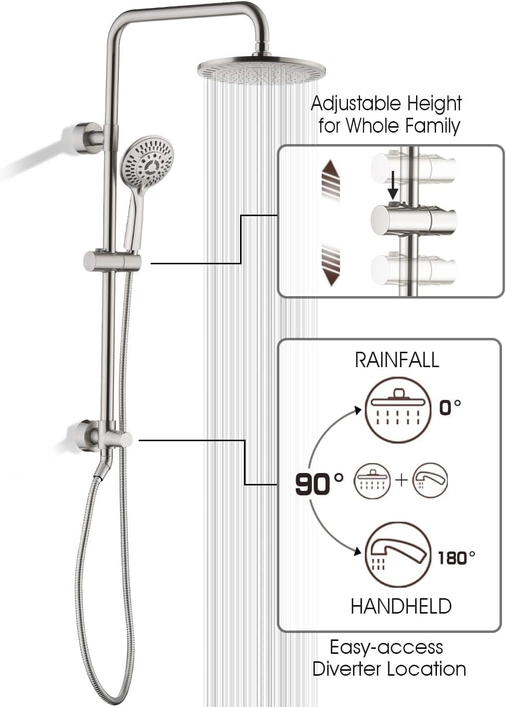 | Included Components | 60" Shower Hose, Handheld Shower Head, Rainfall Shower Head, Slide Bar with 3-way Diverter |