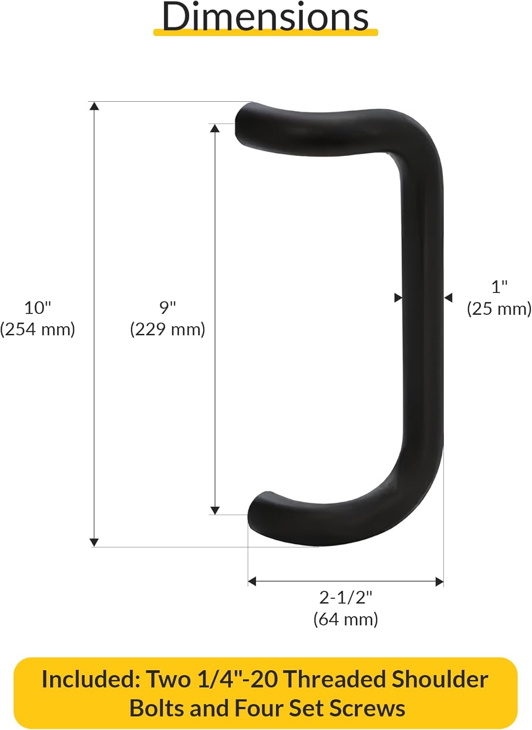 The Brixwell aluminum pull handle is designed for use on narrow, medium, and wide stile doors, making it suitable for a wide range of residential or commercial applications. With an overall length of 10" and a 1" diameter, the handle offers ample gripping space for daily use. Its 9" center-to-center mounting spacing aligns with common installation templates, allowing easy setup or replacement on existing doors. The handle projects 2-1/2" from the mounting surface, providing room for hand clearance without obstruction. Constructed from aluminum with a matte black finish, it offers resistance to typical indoor and outdoor conditions while maintaining a clean, neutral appearance. Whether used as an entry handle, cabinet pull, or shower grip, this product fits many different door setups and mounting requirements. It includes mounting hardware for a secure, flush fit and is compatible with narrow, medium, and wide stile designs. Suitable for both left- and right-hand installations, it supports functionality across doors, cabinets, and shower enclosures. This pull handle works well in homes, offices, retail environments, and hospitality spaces where a simple and functional door grip is needed. Includes two 1/4"-20 threaded shoulder bolts and four set screws for secure mounting. Metal washer not included.