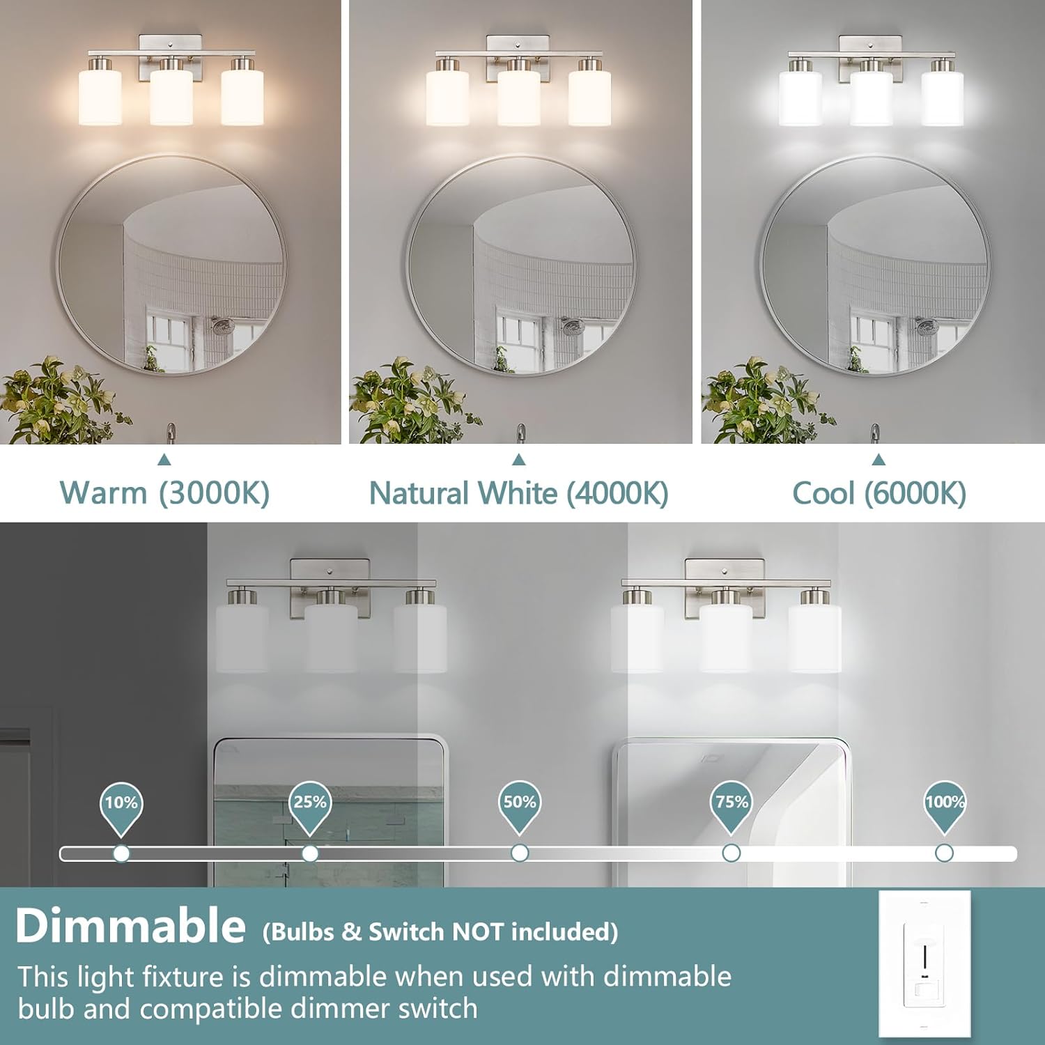 | Light Color | 3000K-6000K, Compatible with dimmable bulbs and dimmers |