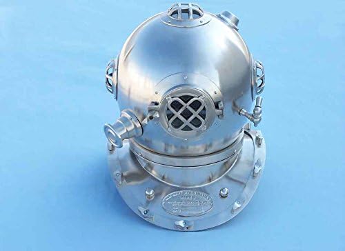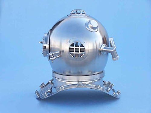 The Brushed Nickel Divers Helmet 19 inch is the perfect accent for any nautical themed room. This brushed nickel finish adds a stylish matte finish not found in all diving helmet replicas. This diver helmet replica is 19 tall. This diving helmet is a replica of the deep sea diving helmet and is constructed of solid, brushed, heavy duty solid nickel, and features 4 viewing holes, helmet rivets, and replica latches. Place this beautifully crafted diving helmet on a desk, table, or shelf in any home or office to add a lovely conversation piece that no nautical decor collection is complete without. Dimensions: 19 inch L x 12 inch W x 18 inch H Handcrafted from nickel Extremely durable and sturdy Brushed nickel grills and fittings Excellent nautical theme gift
