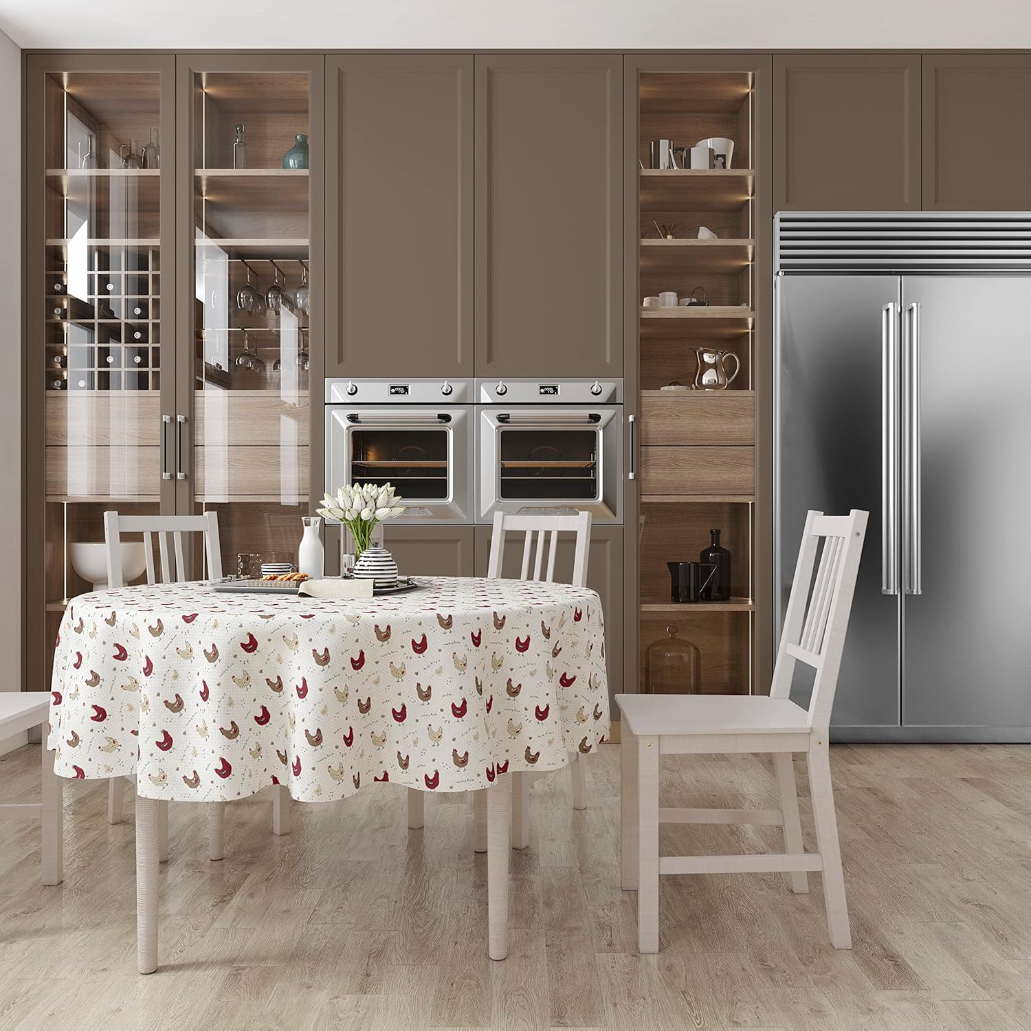 Delightful chicken themed tablecloth featuring chickens, chicken foot prints, hearts, and polka dots in shades of red and tan. 100% cotton. Machine wash cold, tumble dry low. Made in India. This charming tablecloth is great for entertaining or to enjoy everyday. Matching placemats and napkins available separately. Perfect to complement your farmhouse decor.