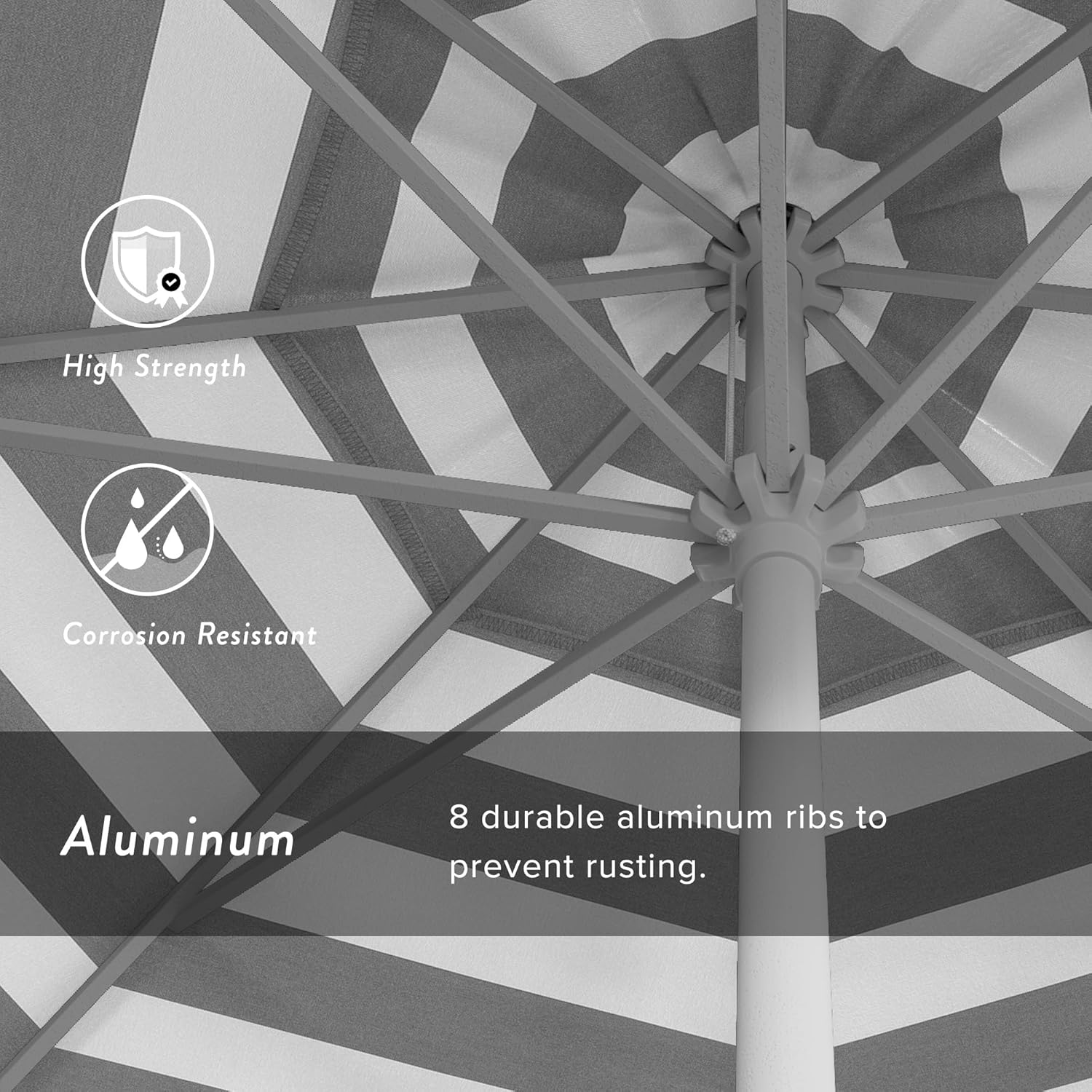 | Model Name | California Umbrella 9' Rd Aluminum Patio Umbrella, Crank Lift, Auto Tilt, White Finish, Grey/White Stripe |
