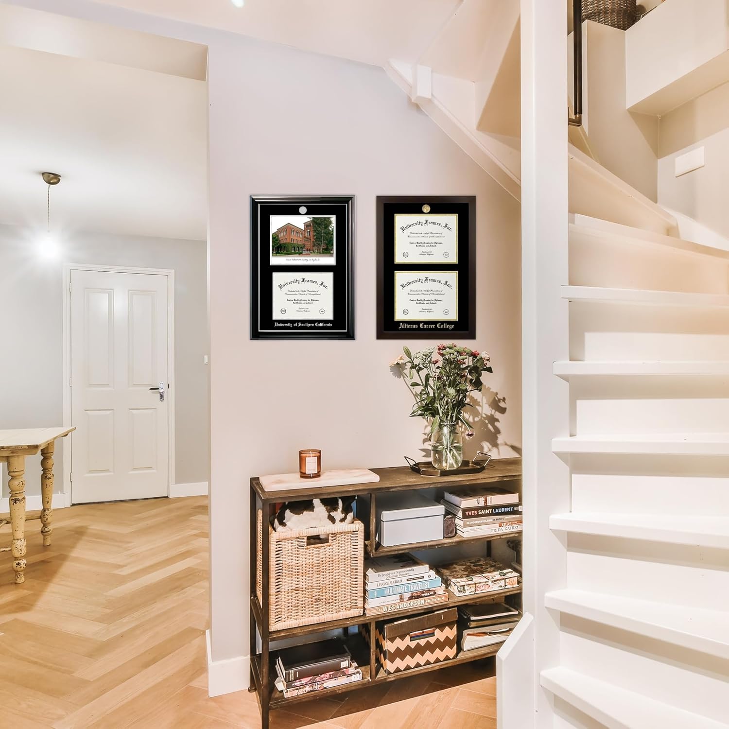 Satin Mahogany diploma frame, Silver embossed with Campus Images lithograph. Silver Medallion or Foil seal with the official university marks and imprinted with University name. Everything you need to insert your document and hang the frame is included.