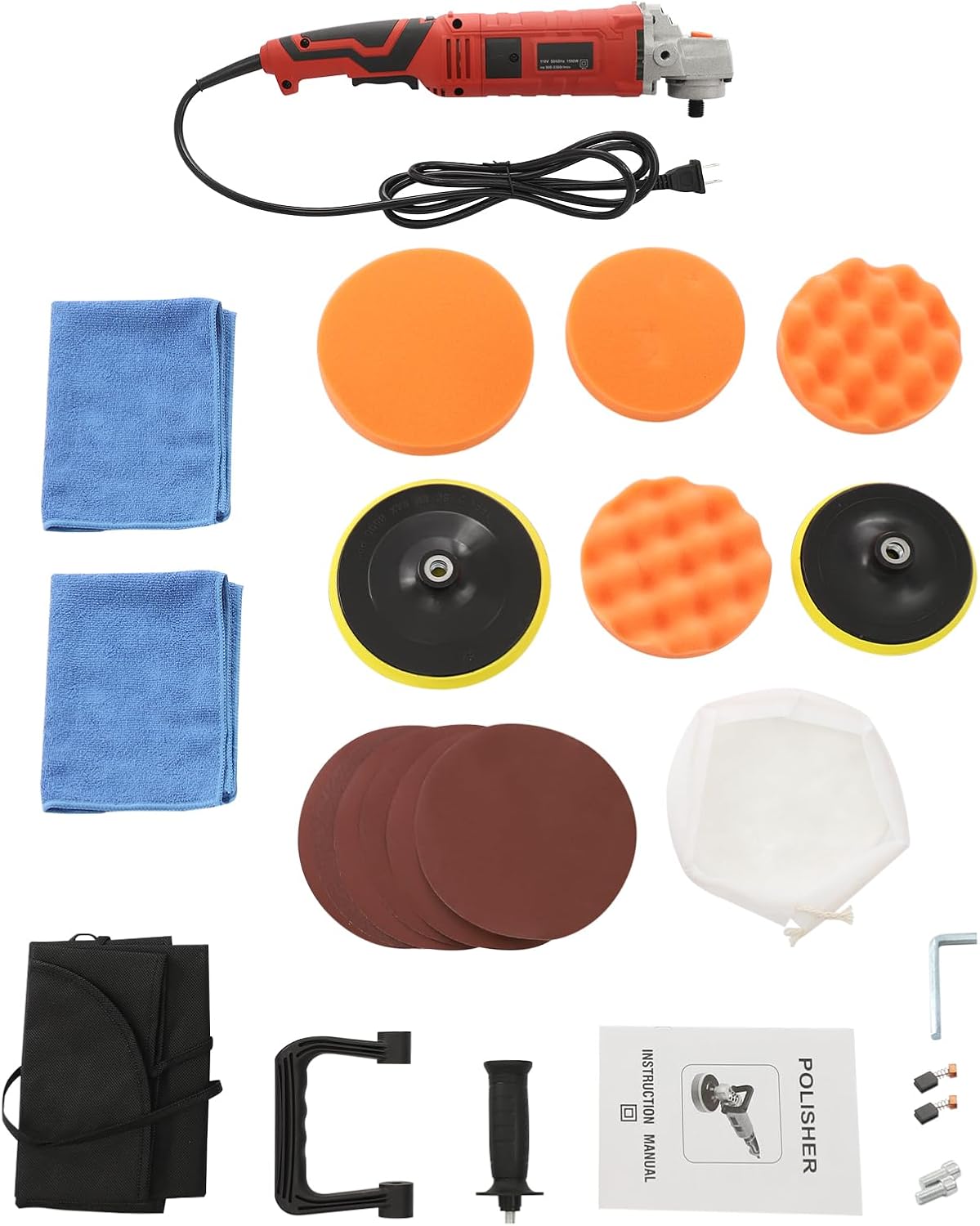 | Included Components | 1* Polishing Machine 1* Auxiliary Handle 1* Spare Handle 2* Self-adhesive Discs, 2* Medium Coarse Polishing Pads 2* Waveform Sponge Pads 1* Wool Pad 6* Sandpaper 1* Wrench 2* Screws, 3* Carbon Brushes (One Already Installed) 2* Towels 1* Apron 1* English Manual |