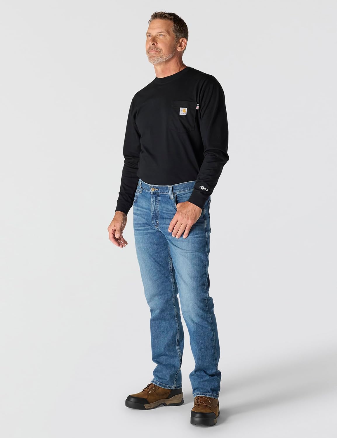 These men's Carhartt FR jeans offer protection and comfort on the job. Made of flame-resistant denim with enough flex for easy movement. Cut for a relaxed fit that's comfortable through the seat and thigh, with a straight leg opening that fits over boots. 12.8-ounce, 98% cotton / 2% spandex FR denim. Meets the performance requirements of NFPA 70E and ASTM F1506. UL® classified to NFPA 2112. Built to move with Rugged Flex stretch technology. Relaxed fit: Comfortable fit through the seat and thigh with more room to move and a straight leg opening #Brass zipper fly with Nomex® FR zipper tape. Arc-resistant button closure at waist. Strong sewn-on-seam belt loops. NFPA 2112 / CAT 2 label sewn on waistband. Carhartt FR label sewn on back pocket. Two reinforced back pockets. Imported