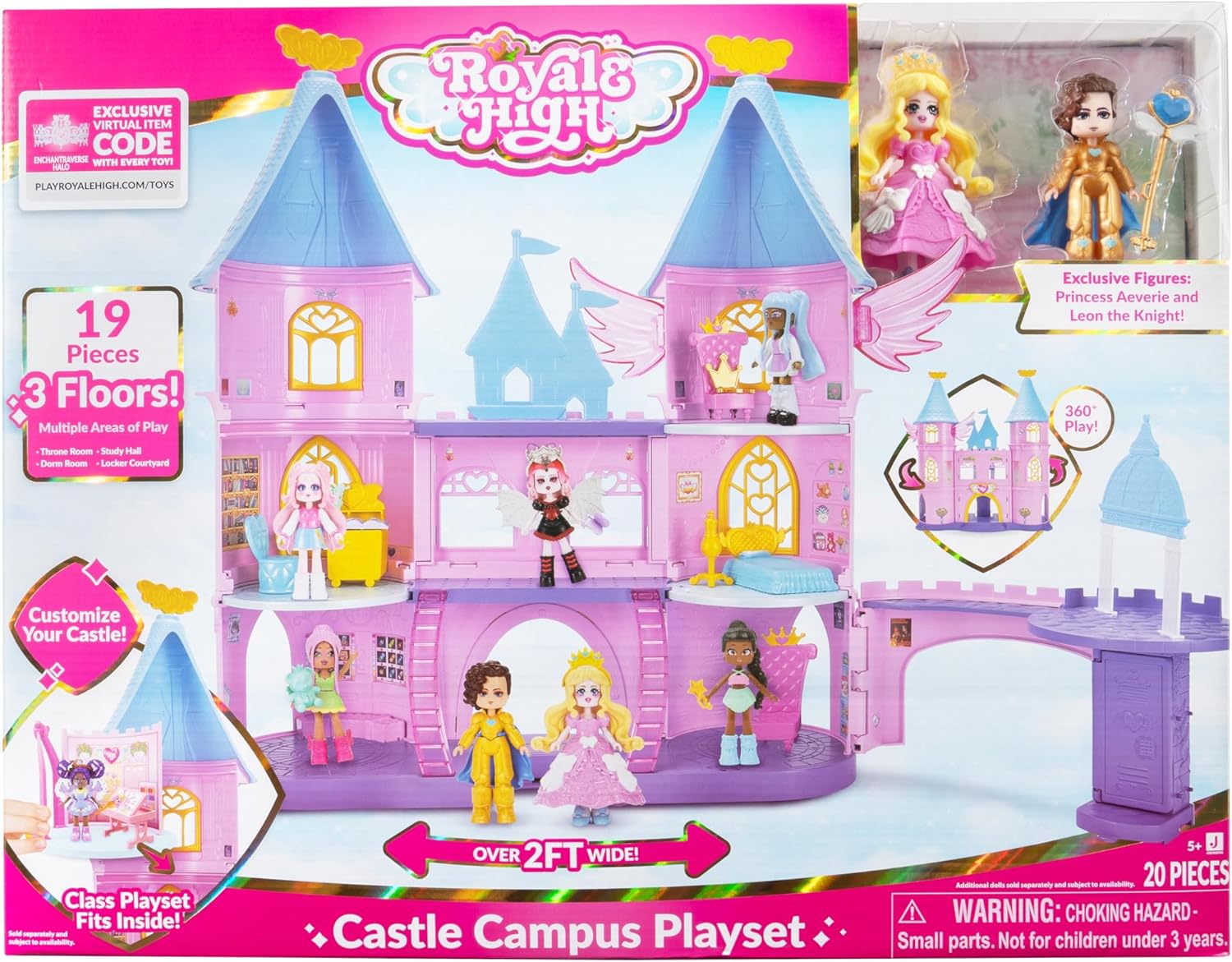 Are you ready to enter a magical world of fashion and style? Royale High is the virtual realm that will captivate anyone, with the new Castle Campus game you can explore 360 and 3 floors, including the throne room, study room and bedroom, so the fun will never go out. You can customize your castle with additional classroom playsets (sold separately). Join the two exclusive 3" dolls, Princess Aeverie and Leon the Knight on an exciting adventure in the castle with accessories like a magic wand, teddy bear, and more. And with a unique game code, you can equip your in-game avatar for all experiences, officially licensed. This set is for kids ages 5 and up. Contains: (1) Castle Campus Game Set (2) 3" Dolls (3) Modular Round Floors (2) Thrones (1) Desk (1) Chair (1) Bed (1) Dress Shape (6) Doll Accessories (1) Virtual Item Code.