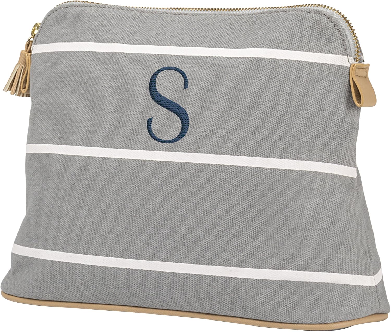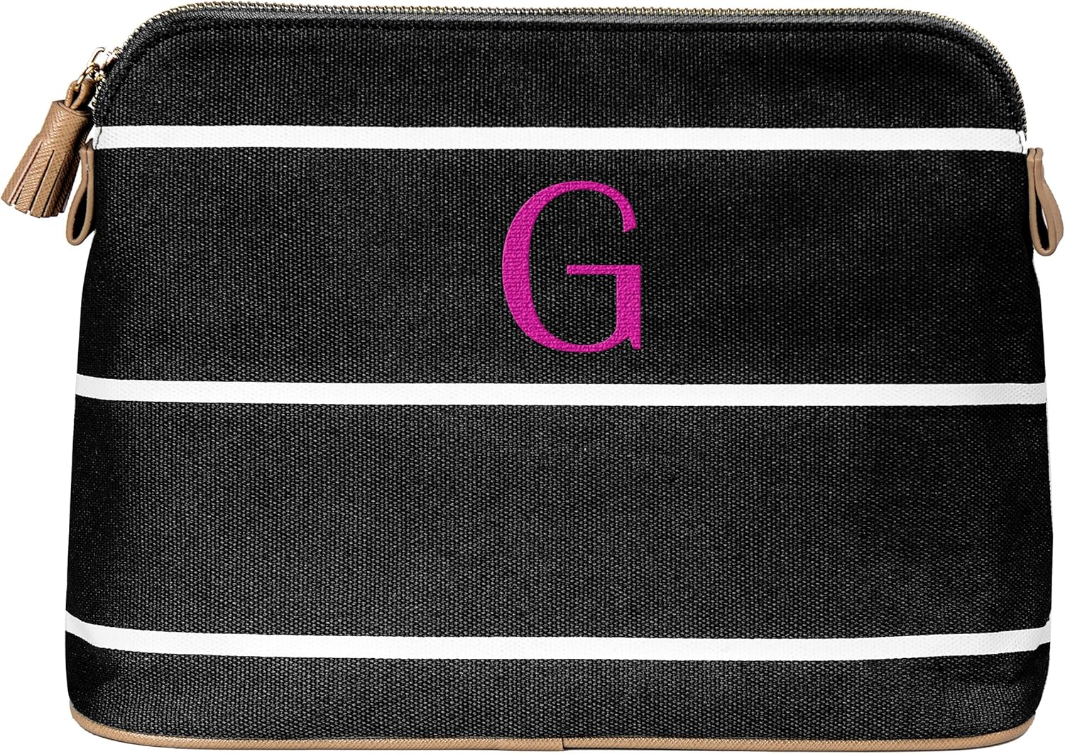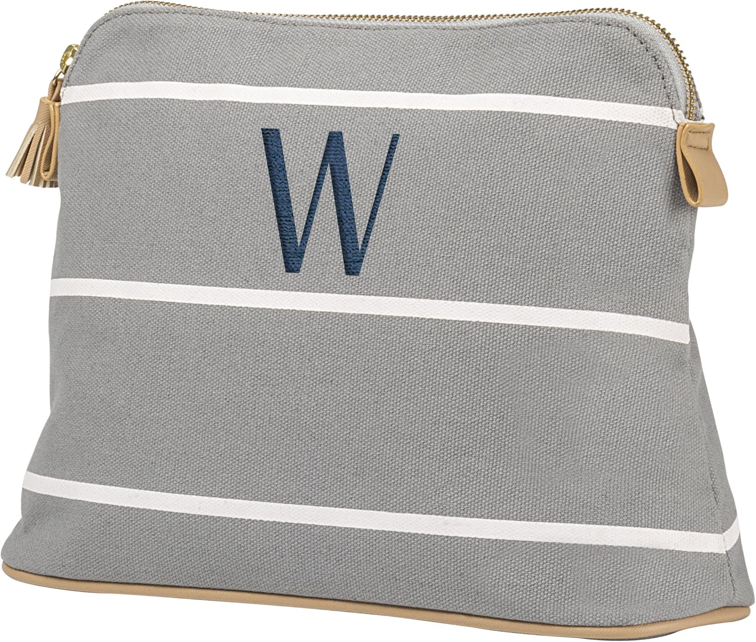 Our personalized striped cosmetic bag is a stylish case that can be used for anything from toiletry and makeup storage to safe and easy travel. Fashioned with a sturdy canvas construction, this cosmetic bag features a wide, fully-lined zipper top, a zippered inside pocket for separate storage, and a spacious interior for all your Preening needs. Great as a gift for any of your girlfriends or as a special treat for yourself.