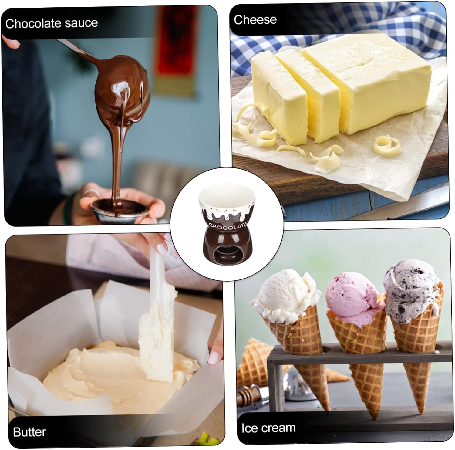 Package List 1 x Chocolate Melting Pot 1 x Bowl Characteristics -Size: 14.50X12.00X12.00cm/5.70X4.72X4.72in Chocolate Fondue Pots -Material: ceramic Ice Cream Melting Pot -Color: As shown Detachable Fondue Pot - Simple in structure, easy and convenient for you to use and operate Cheese Warmer. - The melting pot is suitable for kitchen, dining room, outdoor party, afternoon tea, etc Butter Warmer. - The melting pot is adopted ceramic material, sturdy and for long-term use Ceramic Melting Pot. - Fine workmanship and creative appearance their popularity and practicality Breakfast Salad Bowl. - for melting butter, cheese, candy, chocolate, candle, caramel, tapas, etc Fondue Pot.Goods DescriptionButter Warmer It is a kitchen utensil for home or restaurant.Ceramic Melting Pot It can be used for chocolate, cheese, tapas, etc.Detachable Fondue Pot Can be heated by candle or alcohol stove.Ice Cream Melting Pot This item is a melting stove for butter or chocolate, made of ceramic material, and to use