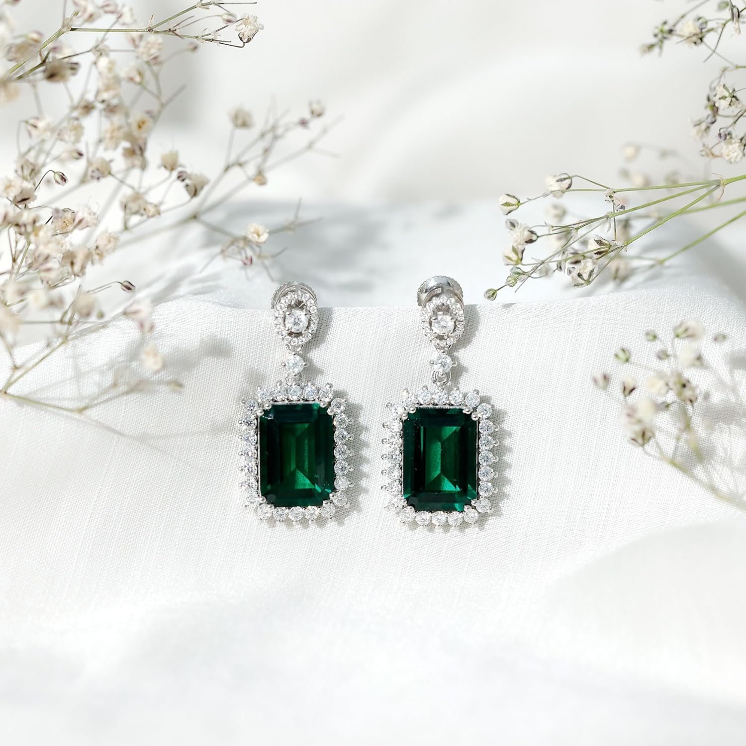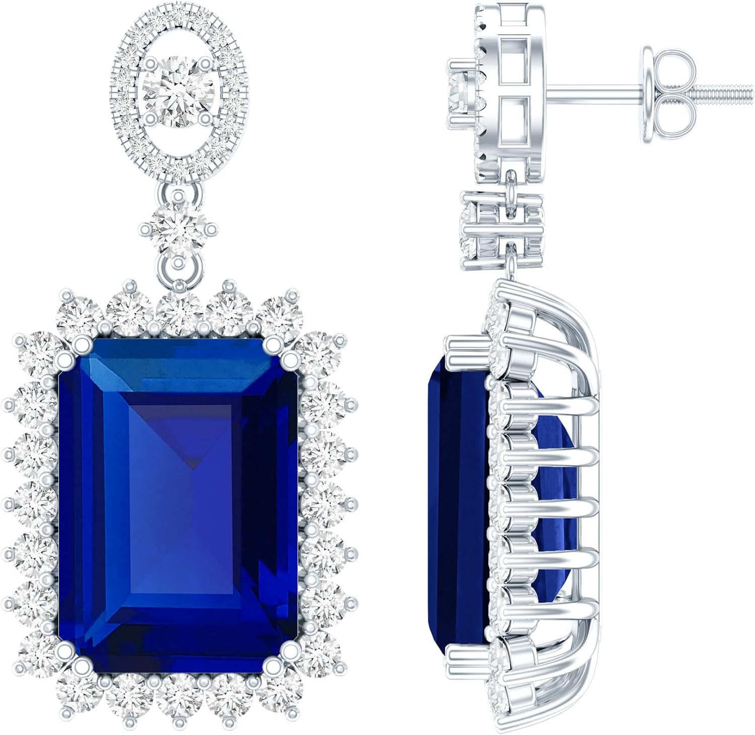 A timeless treasure for the woman who wants to shine brightly on special occasions, these Dangle Drop Earrings are a perfect blend of elegance and sparkle. They feature emerald cut lab grown orange sapphire in the center set in prong setting with a halo, above this centerpiece a dazzling oval shape motif is placed, encrusted with dainty round cut moissanite stones, adding a touch of brilliance and charm. Secured with screw back closure and crafted in 14K White Gold Plated Silver, these Bridal Dangle Earrings exemplifies the passion for meticulous craftsmanship and attention to detail. Designed for versatility, these Orange Sapphire Earrings are an ideal choice for bridal wear, remarkable celebrations, or even as a refined statement piece for elegant evenings.