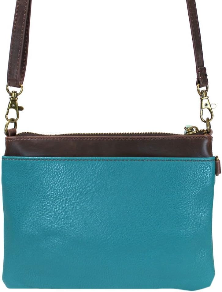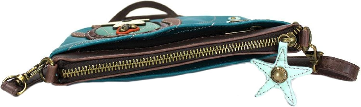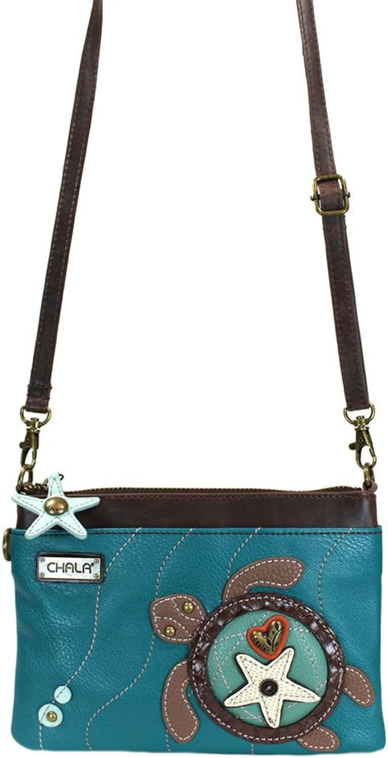 Sea Turtle - Mini Crossbody Convenient, Versatile, Compact Front zipper pocket adorned with our cute Sea Turtle character! Detailed stitching and starfish zipper pull Rear slide pocket Three credit card slots inside Two Adjustable straps that are detachable Top zippered pocket Patterned fabric lining with inner slide and zipper pockets. Materials used: Faux Leather Color Turquoise Approx. Measurements 8" x 0.5" x 6" Strap adjustable 7"~30"