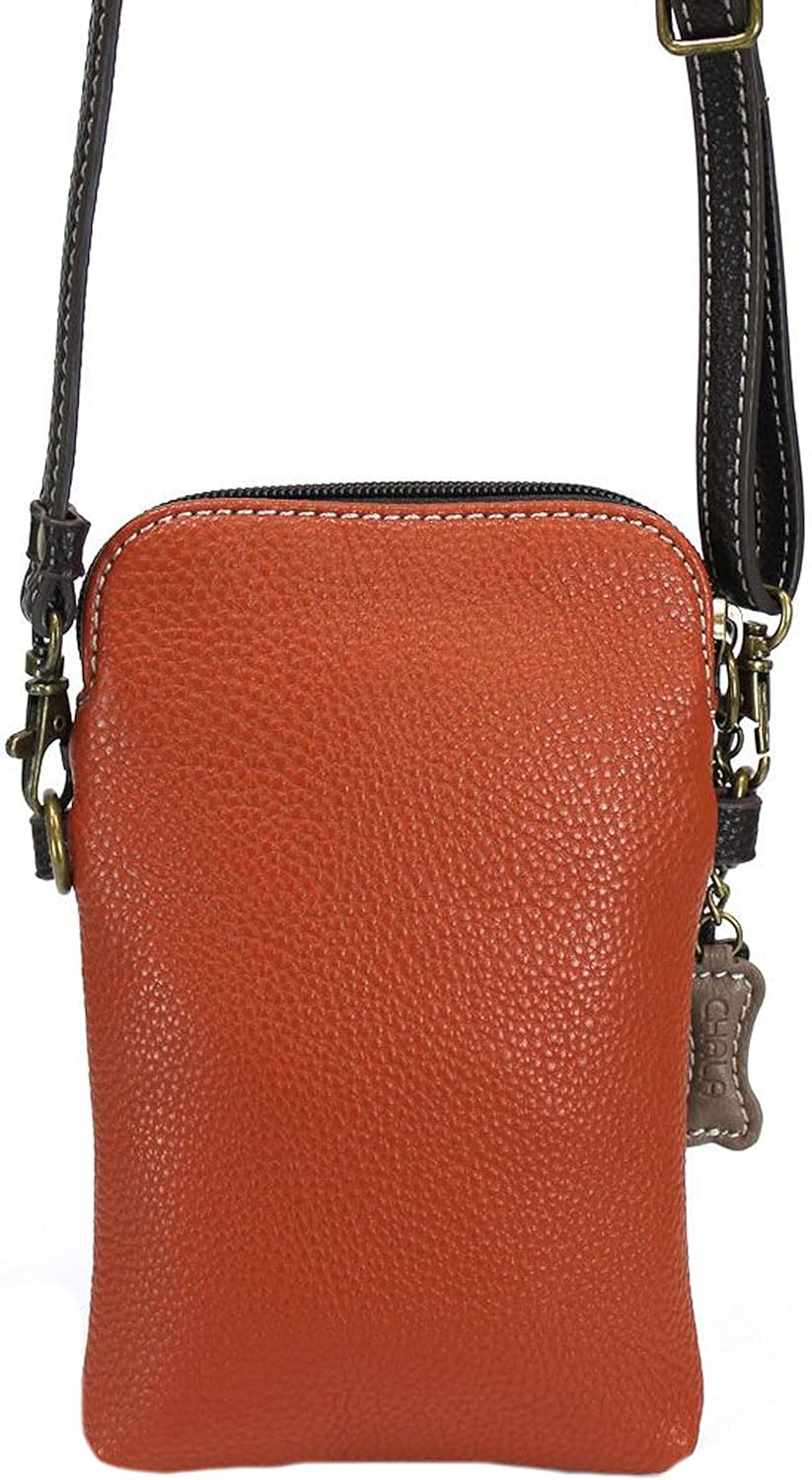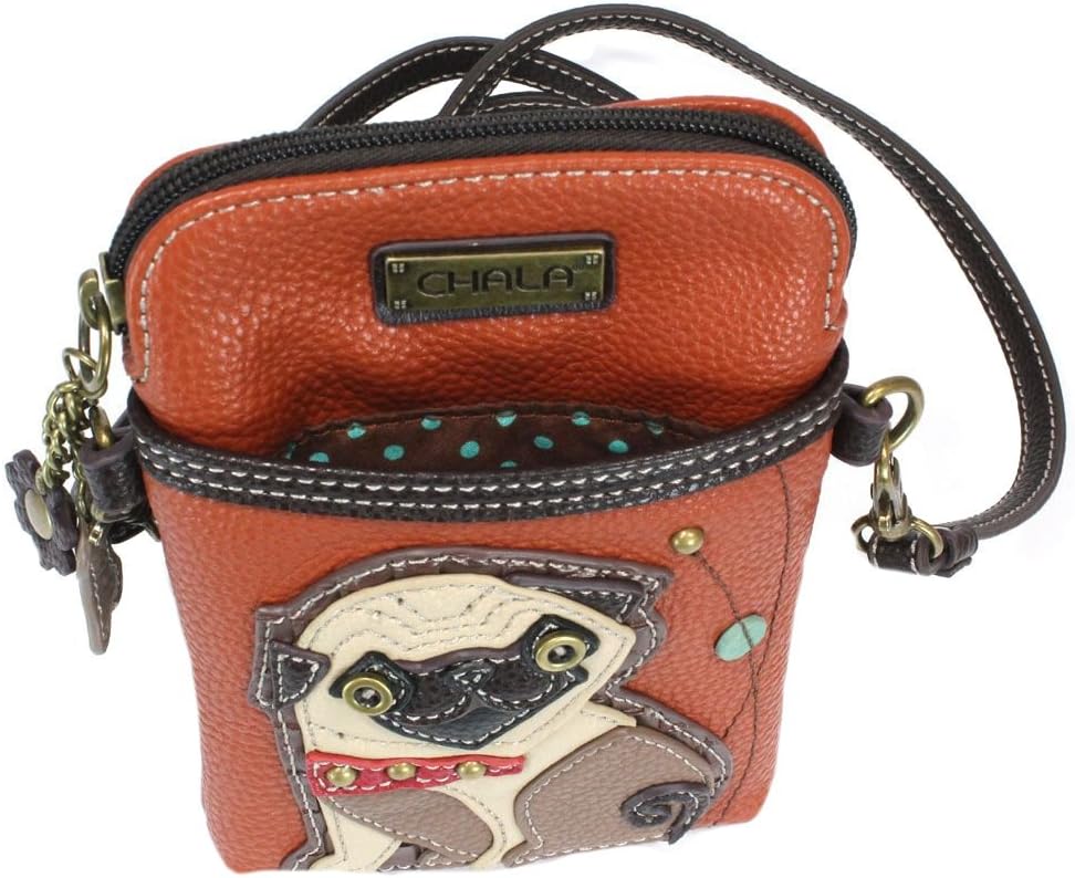 Pug - Cell Phone Xbody Convenient, Compact, Fun Small front pocket adorned with dopey pug Adjustable strap - turn bag into a purse, a crossbody bag, or even a pouch! Top zipper closure Bone and flower zipper pull Soft lining inside 3 credit card slots inside 2 Adjustable straps that are detachable Extra padding throughout bag to protect your cell phone Materials: Faux Leather Color: Orange Dimensions: 5" x 7.5" x 1" Strap adjustable: 7"~30"