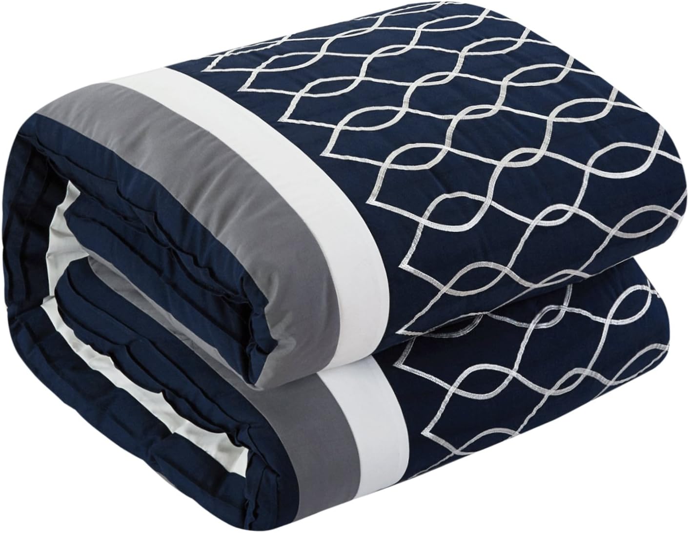 Complete the look! Looking for a bedroom ensemble that has everything? Look no further! A Luxury Embroidered contemporary design alongside quilted embellished detail is the ultimate luxury for your master suite. This comforter set, sheet set, decorative pillows, shams and coordinating window treatment sets all match and are all included in this super set. Enjoy luxury details and trims in a color blocking theme that is sure to decorate your entire master suite or guest bedroom in one purchase. Specifications: • Size: Queen • Color: Blue • Piece Count: 24 • Set Includes: • 1pc Comforter (90" x 92") • 1pc Bed Skirt (60" x 80" x 14") • 1pc Fitted Sheet (76" x 80" x 12") • 1pc Flat Sheet (90" x 102") • 4pc Pillowcase Set (21" x 27" + 3") • 2pc Shams (20" x 26") • 2pc Euro Shams - Solid with piping detail (26" x 26") • 1pc Decorative Pillow (18" x 18") • 1pc Decorative Pillow (12" x 18") • 4pc Window Panels (40" x 84") • 2pc Valances (84" x 18") • 4pc Curtain Ties • Shipping Dimensions (approx.): L 20" x W 20" x H 13" • Materials: Brushed microfiber fabric, Synthetic down alternative filling Fabric and Design: • Silky soft brushed microfiber material • Fashion forward ruffled design with pleated details and trim Features: • Luxuriously soft feel for a great night sleep • Hypoallergenic down alternative filling is perfect for those allergic to traditional down • Built to last with premium fabrics and expert stitching Care Instructions Dry clean preferred. Machine washable, use front loader machine (or top loader without agitator) to avoid tearing, use cold water on gentle cycle, tumble dry low * Add 2 tennis balls to the dryer to speed up drying and add fluffiness The digital images we display have the most accurate color possible. However, due to differences in computer monitors, we cannot be responsible for variations in color between the actual product and your screen.