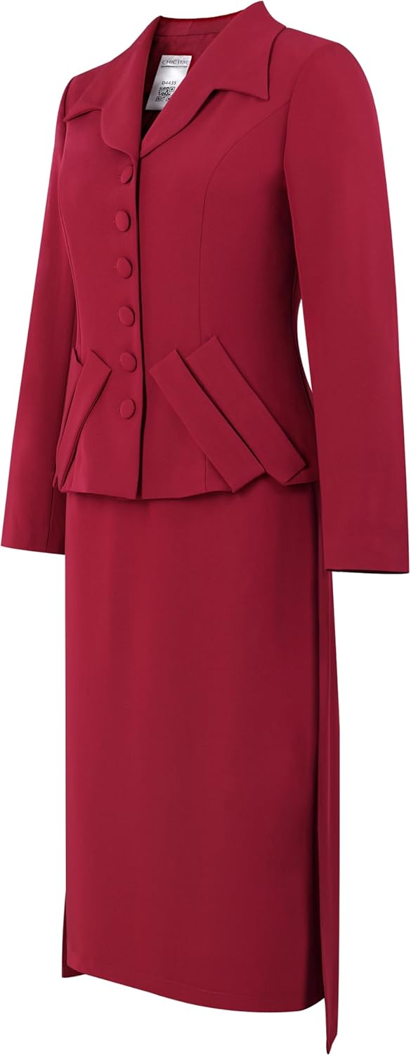 This sophisticated two-piece ensemble is a timeless choice for formal occasions. The tailored jacket with its structured shoulders and peplum waist flatters the feminine silhouette. The knee-length pencil skirt completes the ensemble, creating a sleek and refined appearance. Perfect for the office, weddings, or special events, this suit exudes confidence and style. 2pcs jacket skirt suit with panels in waist. Front buttons closure for the jacket. Elastic waist and side zip for the skirt. Fully lined. Jacket: standard size S approx. length: 56 cm/ 22 inches; Plus size approx. length: 65 cm/ 25.6 inches. Skirt: standard size S approx. length: 80 cm/ 31.5 inches; Plus size approx. length: 89 cm/ 35 inches. MATERIAL: LINING 100% POLYESTER; SHELL 60% POLYESTER 29% RECYCLED POLYESTER 4% LYOCELL 7% SPANDEX. CARE: MACHINE WASH WASH SEPARATELY DO NOT BLEACH WARM IRON DO NOT TUMBLE DRY.