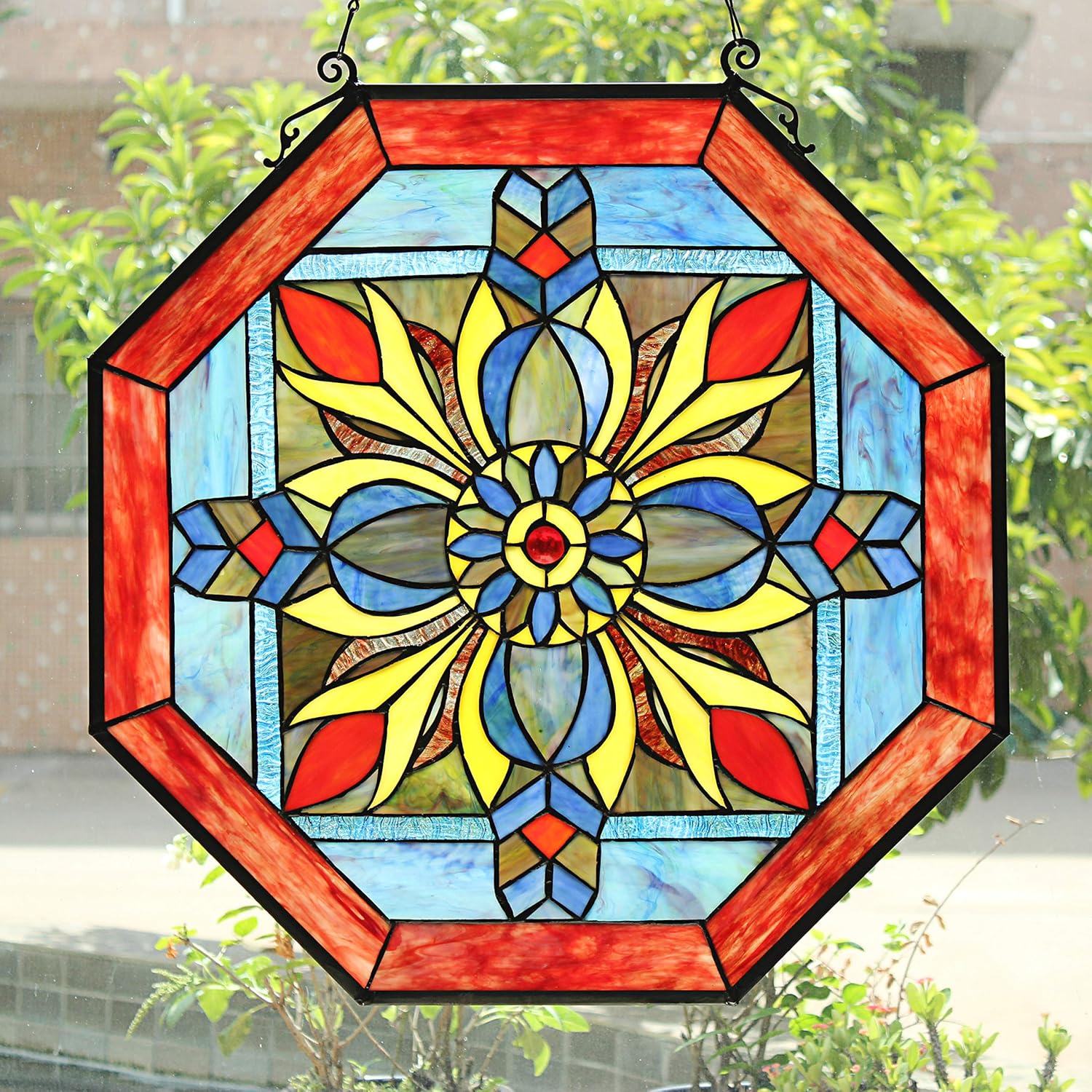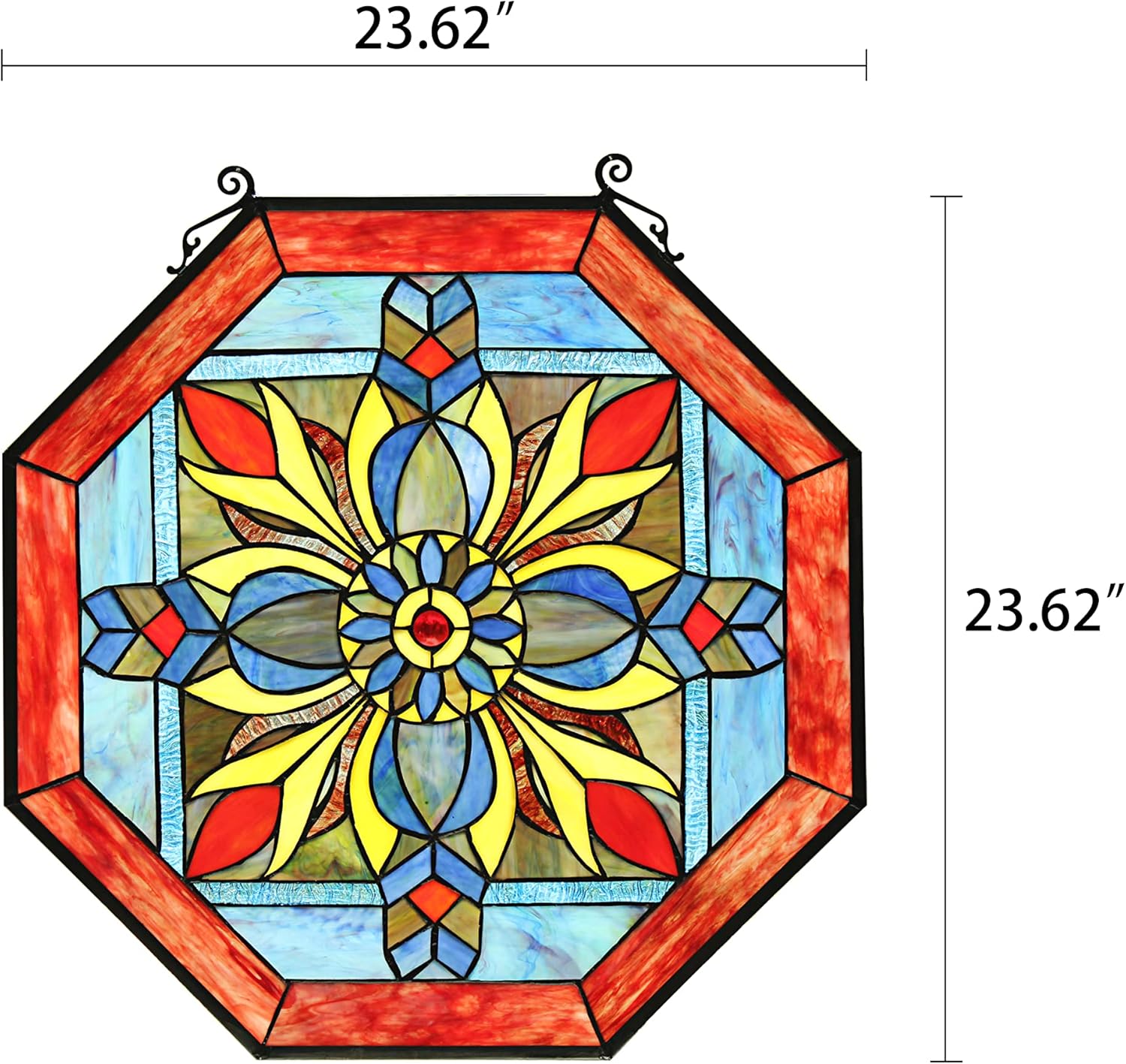 Dream Catcher, named after Native American styled dream catchers, features bright red, blue, and yellow colors designed to look like feathers, is a stunningly designed stained glass window panel. The hand crafted Tiffany panel is made up of over 160 pieces of hand cut, stained art glass and 1 glass bead, expertly pieced and soldered together, to create each panel. Each of CHLOE's Tiffany-style stained glass panels are formed using the very same techninique developed by Louis Comfort Tiffany in the early 1900's, using hand cut stained art glass, each wrapped in fine copper foil and soldered together at extremely high temperatures to form each unique panels. This panel would look great in the livingroom, kitchen, dining room and bedroom windows. Exact size to the nearest inch may vary, and exact color of each glass piece may vary due to each piece being hand crafted. First image is with the light shining through, second image is with no light. Dry listed and recommended for an indoor setting only. This panel comes with a 31.5" hanging chain.