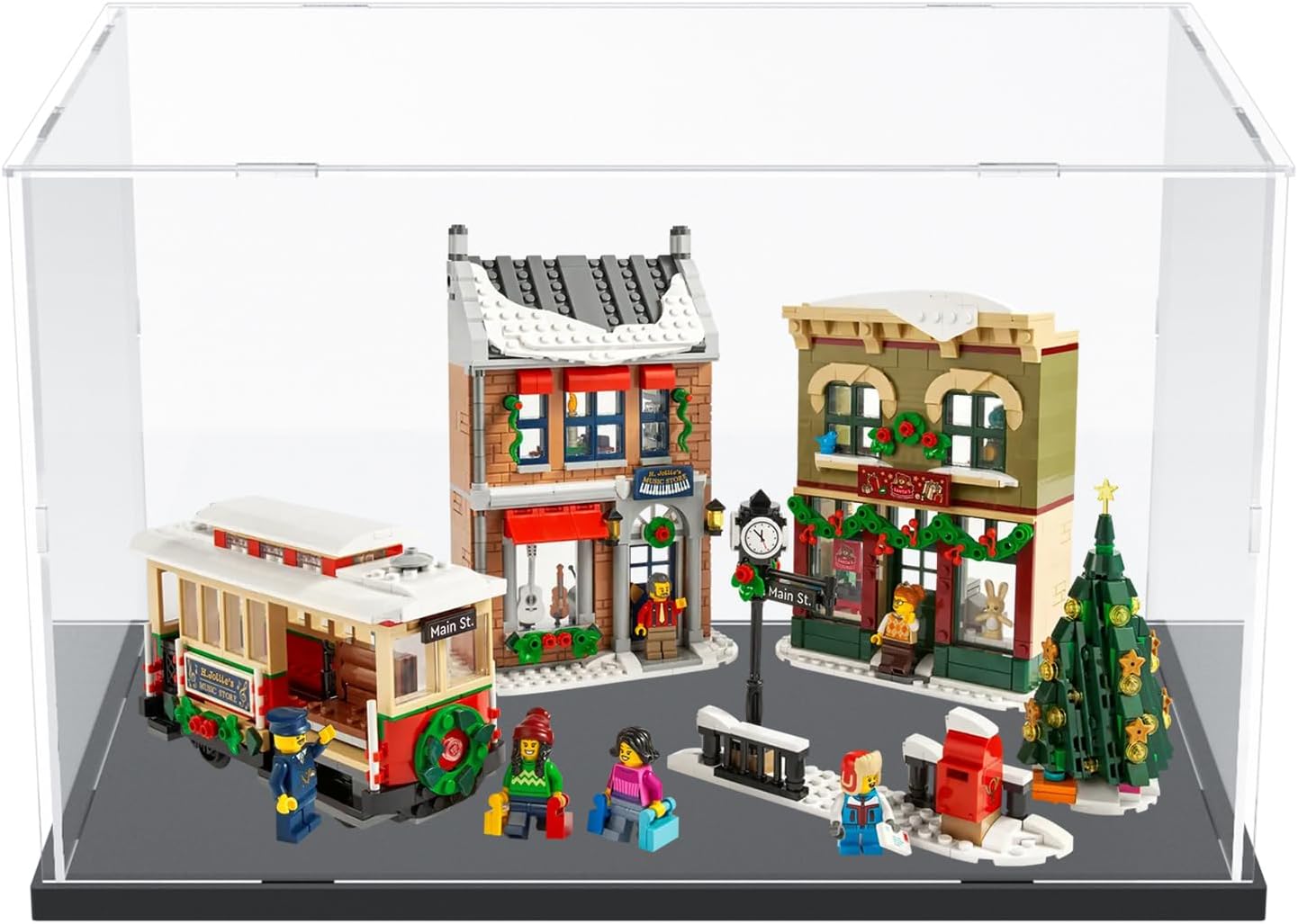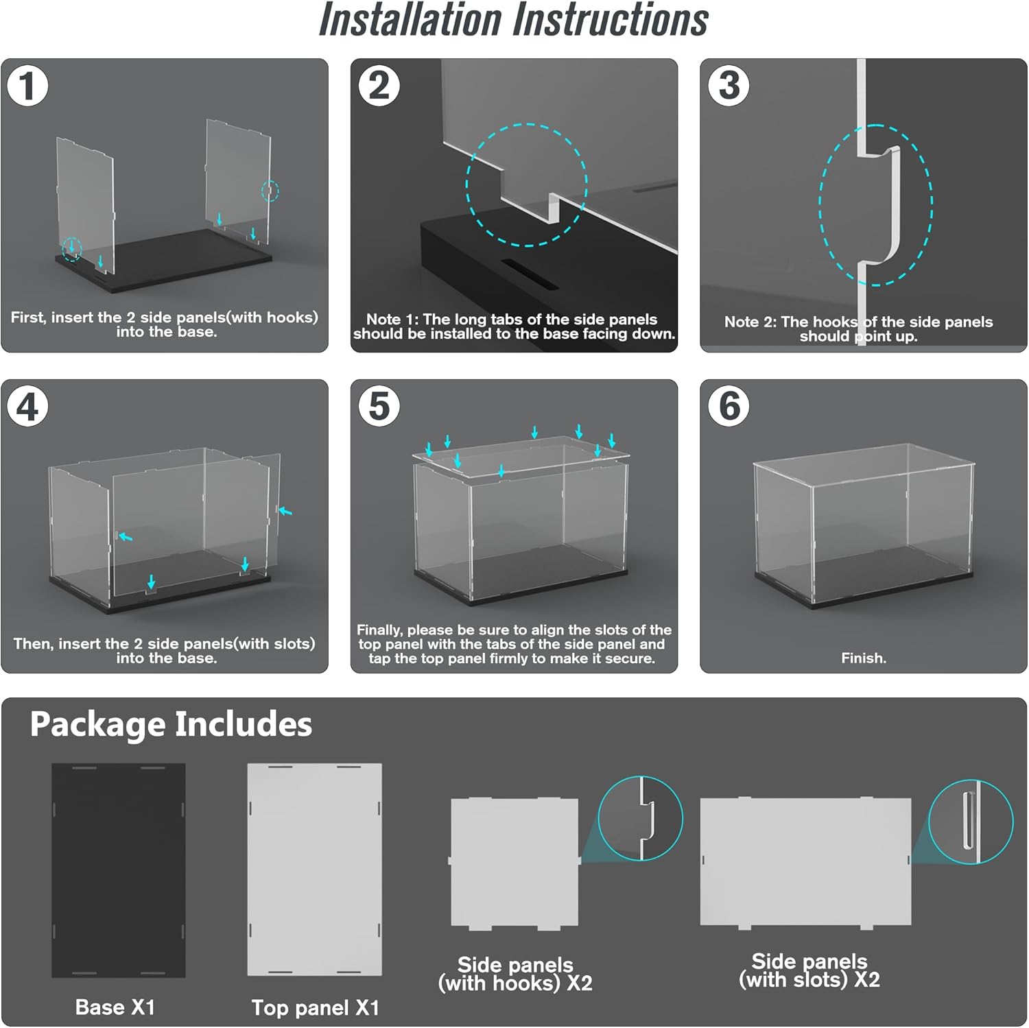 Advantages Transparent display design: The surrounding panels are made of high-quality 3mm thick clear acrylic sheets, which are crystal clear. Up to 98% transmittance which can show your favorite collectibles more clearer. Stackable design: The base is made of high-quality 10mm thick matte wood-plastic board, which is sturdy and stable. You can stack the display case in multiple layers according to your needs. Dustproof function: This acrylic display case can protect your model item from dust and reduce UV ray damage. Color and Size Black: 15.7x9.8x9.8 inch(40x25x25 cm) White: 15.7x9.8x9.8 inch(40x25x25 cm) Package Including 1 x acrylic display case 1 x decor strip(1.5 meters long) 1 x instruction 1 x cleaning cloth 1 x pair of gloves Installation Instructions Tip 1: Before installation, please wear gloves, tear off the white protective film on both sides of the acrylic sheet, and keep all parts clean. Tip 2: It is recommended to place the display item on the base and put on the light strip before installation. Step 1: First, insert the 2 side panels(with hooks) into the base. (Note 1: The long tabs of the side panels should be installed to the base facing down.) (Note 2: The hooks of the side panels should point up.) Step 2: Then, insert the 2 side panels(with slots) into the base. Step 3: Finally, please be sure to align the slots of the top panel with the tabs of the side panels and tap the top panel firmly to make it secure. Finish. Question 1: The top panel cannot be installed. Answer: In order to make the display case can be a firm unit, the slots of the top panel and the tabs of the side panels are designed to be very tightly(The tab will be the same size as the slot, or a little bigger than the slot). You can use a file to make the larger tab smaller. Or you can remove the top panel and reinstall it, taking this one slot tab that cannot be installed in place as the first one and start installing it. Question 2: How to take out the display item? Answer: You can remove the top panel.
