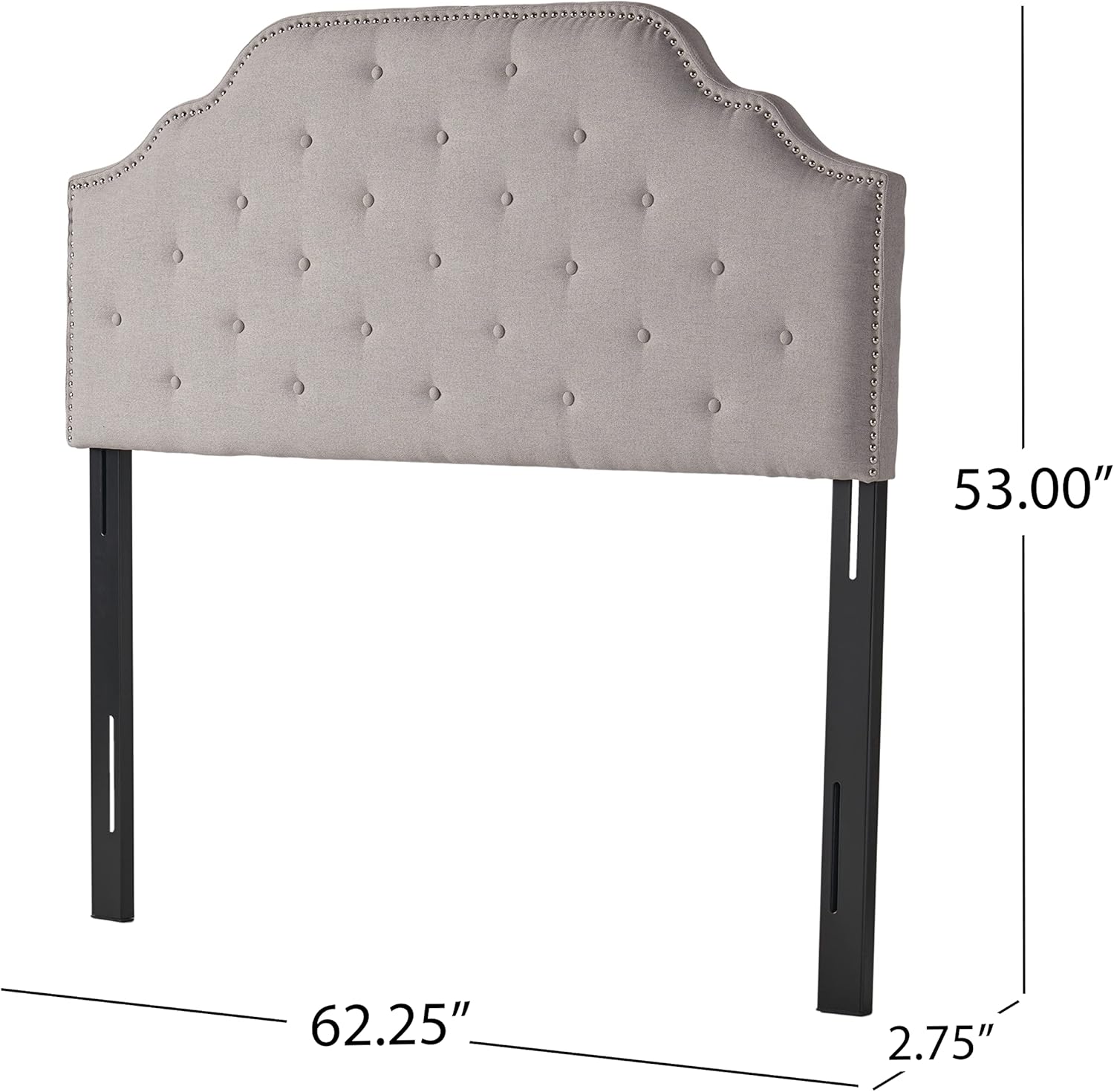 Add a little something extra to your bedroom with a headboard that offers button tufted textures and gorgeous diamond stitching. Featuring a camelback silhouette and impressive nailhead accents, our headboard takes a classic design and brings a contemporary twist to create a masterpiece for any bedroom. Complete with adjustable legs, you can easily and conveniently match this to a variety of metal bed frames. This headboard not only gives a refined atmosphere to your home but will also bring you sweet dreams for nights to come. Includes: One (1) HeadboardMaterial: FabricLeg Material: IronColor: Light GrayLeg Finish: BlackHand-Crafted DetailsAssembly RequiredMinimum Dimensions: 2.75 inches deep x 62.25 inches wide x 50.50 inches highMaximum Dimensions: 2.75 inches deep x 62.25 inches wide x 53.00 inches high