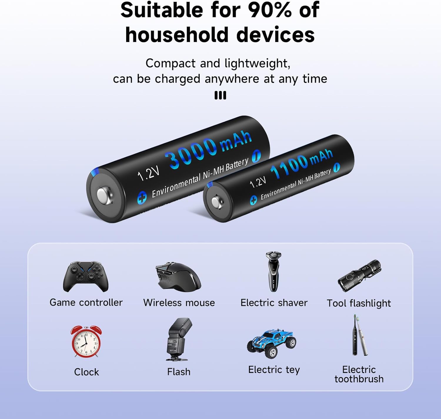 12 Bay AA AAA Battery Charger with 12 Pack AA Rechargeable Batteries set- 1 to 12 AA/AAA batteries at the same time- NiMH/ NiCd batteries in any combination-Battery charger with LCD display design-Intelligently shows the charging status of each chargeable battery-Independent charging channel for each battery-State of the art microcontroller for optimum charge each time-Full charge -dV detection-Safety timer control function-Reverse polarity detection-Short circuit detection and over temperature detection-Auto detection of non-rechargeable battery or defective battery-Refresh function is very helpful for NiCd batteries-Easy to use cycling feature, fully discharges and charges your cells to extend their overall lifespan and performanceSpecifications:-Input: AC 100V~240V 50HZ/60HZ-Output: 12V DC 2A-Rated Charging Current (Normal Charging): AA: 500mA; AAA: 250mA.-Discharging Current: 200~300mA-Applicable battery type: AA/AAA NiMH/NiCd rechargeable batteries-Product Size:230*105*30mmCharging Time:1-12 AAA 900-1100mAh 1-4hrs1-12 AA 2000-3000mAh 4-6hrsPackage Included:1 x Battery Charger(not include battery)1 x AC Wall Adapter1 x Manual