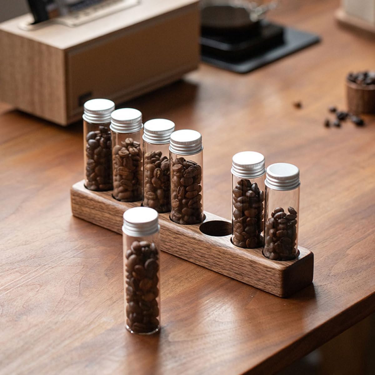 Package List 7 x tube 1 Features - Size: 10.00X2.60X2.60cm/3.93X1.02X1.02in -Material:Glass, wood -Color:Assorted Color -Product Info:Coffee bean storage shelf - Size: 25.20X4.40X3.00cm/9.90X1.73X1.18in - The glass is transparent, can show the original appearance of the contained items, and has high aesthetics, which is convenient to quickly find what you need coffee beans storage jar. - Suitable for storing all kinds of dry goods, sweets and other snacks. And there is a base to fix this transparent storage tank easily coffee beans tube. - The bottle mouth is smooth, does not cut hands, feels comfortable, easy to clean, and can be used multiple times coffee bean storage jar. - Stable wood base can stand on the table stably, which is sturdy and not easy to tip over coffee powder holder. - Enough storage capacity, fine capacity, enough to meet your daily storage needs coffee bean tube with holder.Goods Informationcoffee bean container with rack This product is made of excellent glass and wood material, to use, it is a perfect coffee flower tea display rack, can say goodbye to messy from now on.coffee bean tube storage The is made with strict workmanship and transparent overall appearance