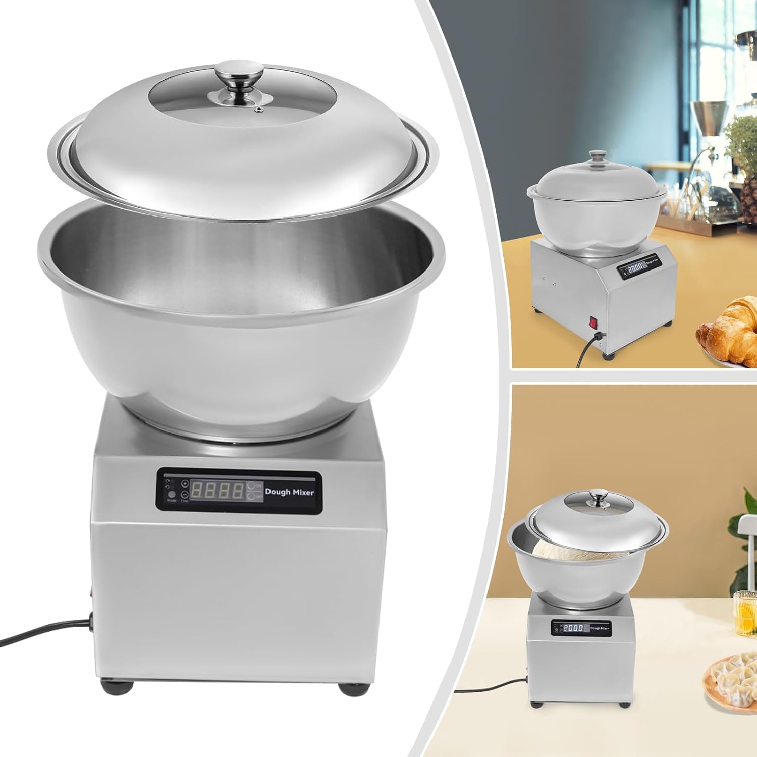 DetailsN-on-slip Feet: They increase the friction and avoid slipping when the machine is running. In addition, they prevent scratches on the table.Clear Lid: The practical glass lid can protect the dough from du-st or foreign objects and allows you to clearly see the state of the dough.ApplicationThe dough kneading machine can mix dumpling filling, dough, and butter, and is suitable for restaurants, bakeries, breakfast shops, noodle shops, dumpling shops, canteens, and home kitchens.SpecificationsColor: SilverMaterial: 201 Stainless Steel, Glass, MetalProcess: Brightening Surface TechnologyPower: 1500WVoltage: 110VPlug Type: US StandardPower Source: Corded ElectricTime Setting Range: 0-30minBasin Wall Thickness: About 1mm/0.04inBasin Base Thickness: About 0.5mm/0.02inMachine Body Thickness: About 1.2mm/0.05inMotor Type: Aluminum MotorMotor Speed: 1400r/minMount Type: Free Standing, TabletopAssembly Required: YesHost Machine Size: 35*27.5*24cm/13.78*10.83*9.45inBasin Height: 17.5cm/6.89inCapacity: 8kg/17.64lbsPackage Size: 44.5*41.5*41.5cm/17.52*16.34*16.34inGross Weight: 13kg/28.66lbsNet Weight: 12.35kg/27.23lbsPackage Included1* Dough Kneading Machine1* English ManualOther Needed AccessoriesNotes1.Please check the size carefully before ordering.2.Please read the manual completely before use, and pay particular attention to the safety instructions included.