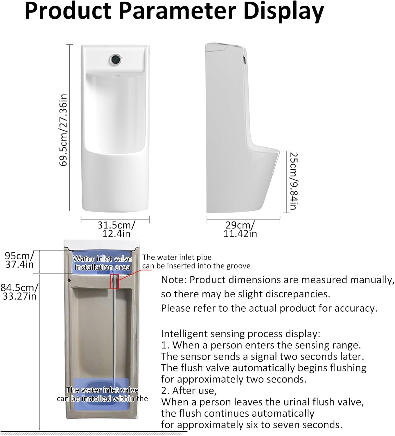 Commercial Washout Urinal Small Bathroom Urinal for Men Space-saving Urinal Universal Washout High Efficiency Urinal Smart, Hands-Free Convenience for Modern BathroomsUpgrade your bathroom with our automatic sensor urinal—a sleek, space-saving solution for homes and businesses. Featuring dual-flush technology (touchless sensor + manual button), it ensures maximum hygiene and reliability. The ceramic construction resists stains and odors, while the powerful, water-efficient flush keeps cleaning effortless. For small bathrooms, basements, or commercial spaces, its wall-mounted design saves floor space without sacrificing style.Easy to install, and designed for zero splash-back, this urinal is for hygiene-conscious households, offices, hotels, and more. A modern upgrade that combines smart tech, sleek aesthetics in oneSpecifications:Name: Urinals for MenMaterial: Ceramic + SensorDimensions: 31.5x29x69.5cm/12.4x11.42x27.36inColor: WhiteFlush Method: Manual/SensorMount: Wall-mountedDrainage: Wall-mountedApplications: Bathrooms, bars, apartments, restaurants, shopping malls, airports, hospitals, schools, and other public restrooms.Packaging: 1 urinalNotes:1. Please confirm the style and size before purchasing.2. Please allow for the water inlet and drain outlet before installation.3. Due to manual measurement, there may be 1-3 cm discrepancies. Please refer to the actual product for accuracy.