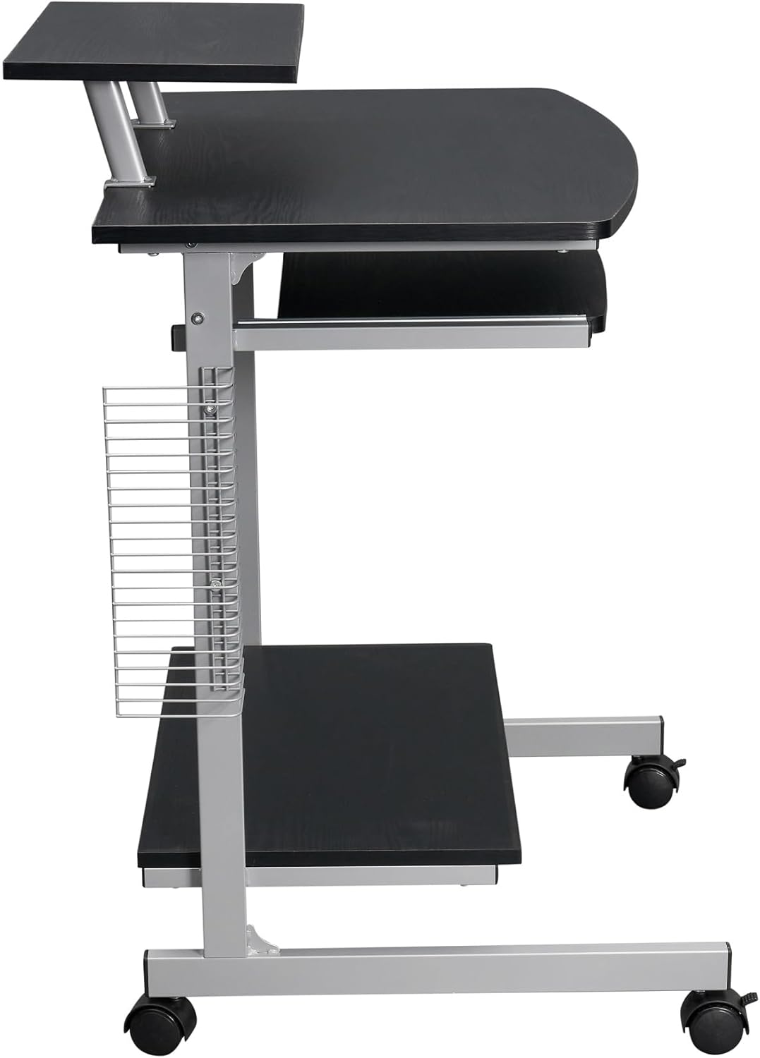 Oosofi Compact Computer Cart With Storage, Espresso This Oosofi Compact Computer Cart is made with heavy-duty engineered wood panels with a moisture resistant PVC laminate veneer and a scratch-resistant powder-coated steel frame. The adjustable shelf can be mounted center, right or left of desktop. It also features a slide-out keyboard shelf equipped with a safety stop, side media rack for CDs or DVDs, bottom accessory shelf, large bottom shelf to accommodate a CPU and accessories, and large double-wheel non-marking locking casters. The desktop has a 100lb weight capacity, the shelves each have a 30lb weight capacity, and the keyboard shelf can hold up to 20lbs. Color: Espresso.