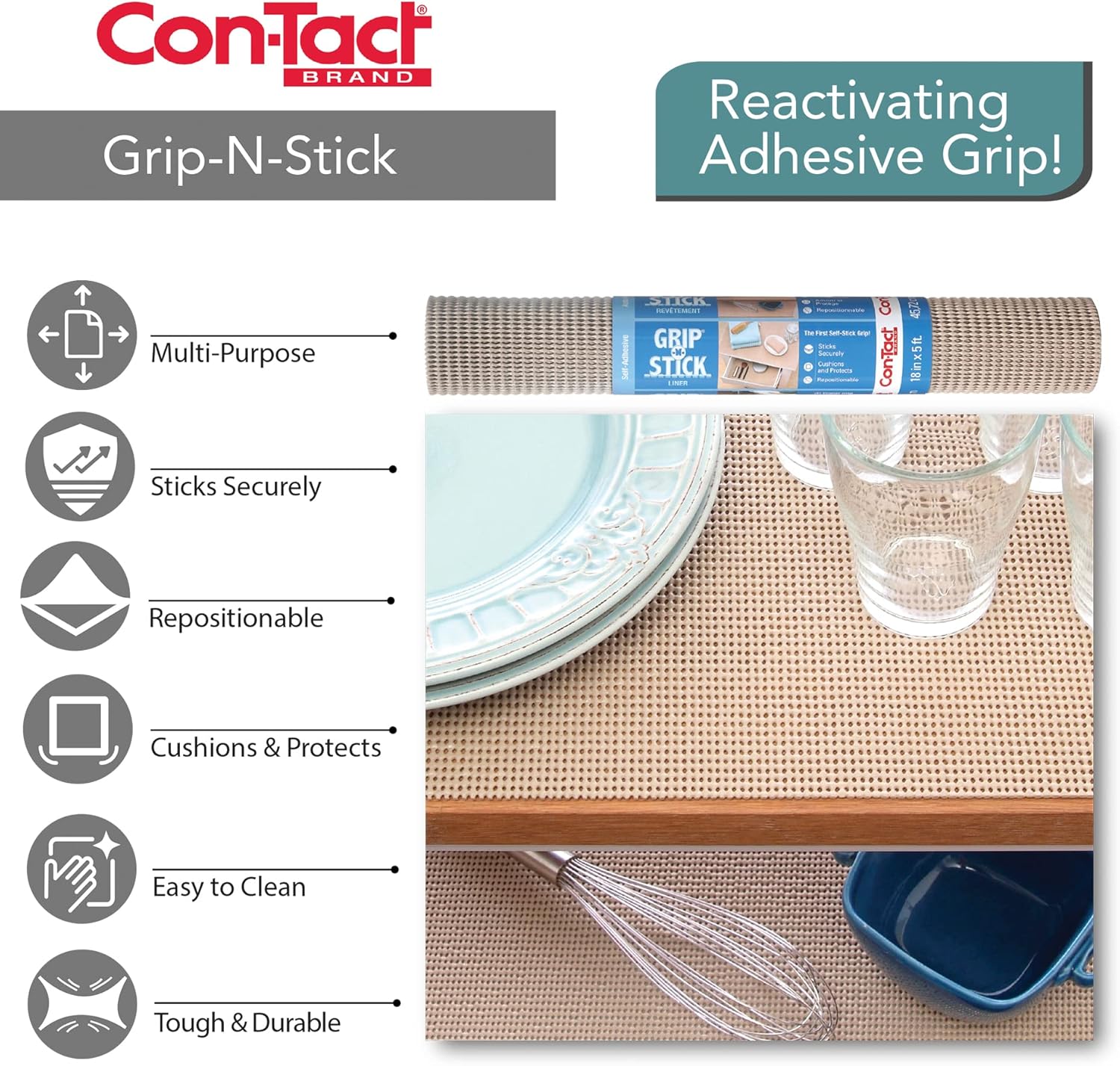 Con-Tact Brand's Grip-N-Stick Durable Self-Adhesive Non-Slip Shelf and Drawer Liner sets the industry standard for the ultimate in high level cushioned protection and are made from a compound designed for its classic grip non-slip properties. These smart design protectant liners are constructed to prevent damage on your floors, shelves, and drawers and the adhesive backing can be reactivated by rinsing liner with warm water and air drying. Con-Tact Brand's Grip-N-Stick Liners works as a barrier in drawers and shelves to keep utensils and dishes neat and safely secure. With our latest innovative and fashion-forward products in sophisticated colors and patterns, Con-Tact Brand products continue to lead the industry. Our colors and premium materials are coordinated from one substrate to another so our customers can mix and match to their delight. As you can expect only from Con-Tact Brand products, our premium high-quality shelf and storage liners lead the industry in quality and value. Whatever the room, whatever the surface, Con-Tact Brand's got you covered.