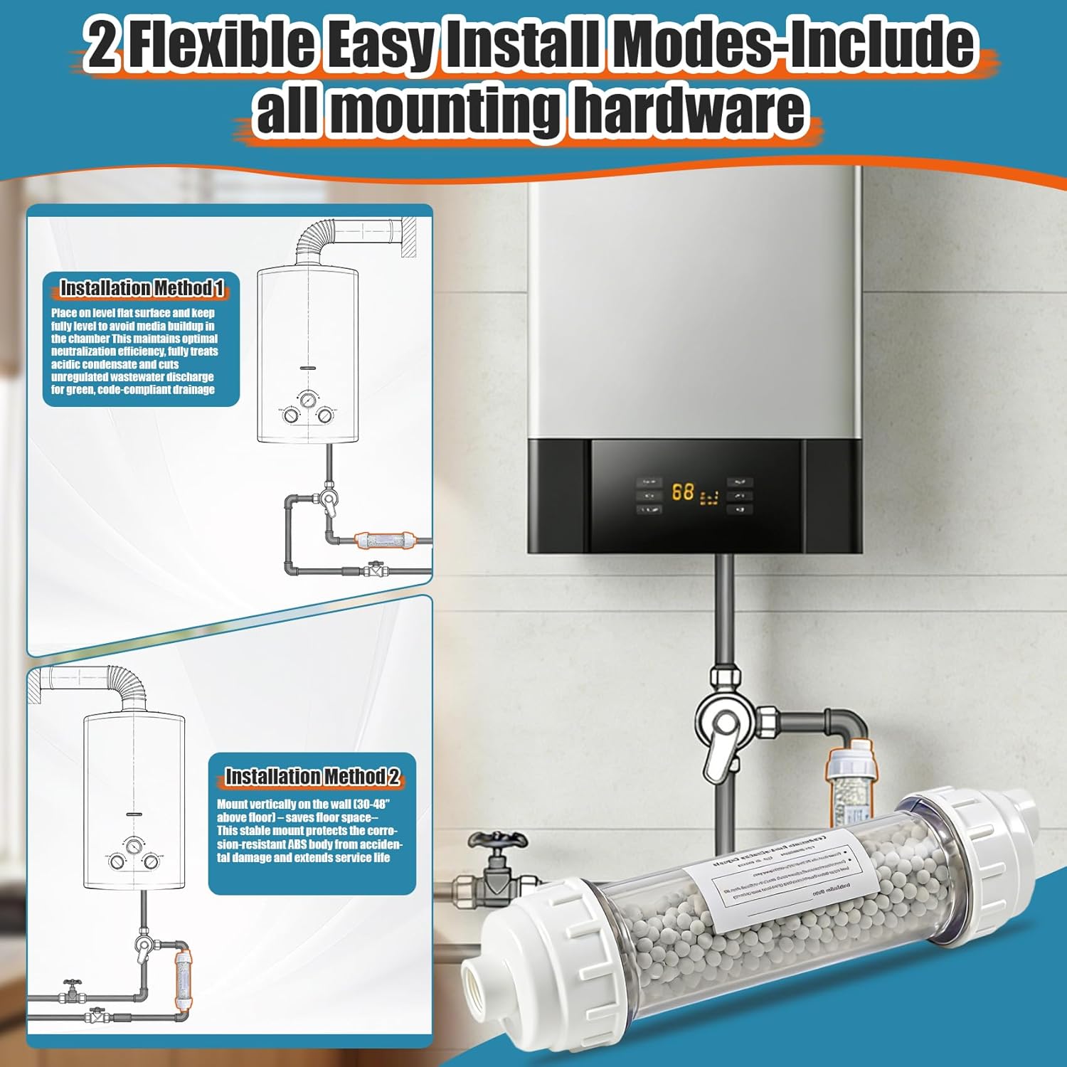 This Condensate Neutralizer Kit is professionally designed to effectively treat acidic condensate produced by tankless water heaters and high-efficiency condensing boilers. By utilizing high-stability microporous pellets, it safely adjusts pH levels and neutralizes acidic water, preventing corrosion, blockages, and costly damage to drain pipes and heating systems Perfectly compatible with Rinnai tankless water heaters, this replacement kit matches OEM standard 804000074 for reliable performance and easy installation. It helps maintain optimal system efficiency, extends equipment service life, and provides long-lasting protection for your plumbing and heating setup Ideal for residential and commercial use, this condensate neutralizer ensures stable and safe condensate discharge, reducing maintenance costs and enhancing the overall durability of your water heating system