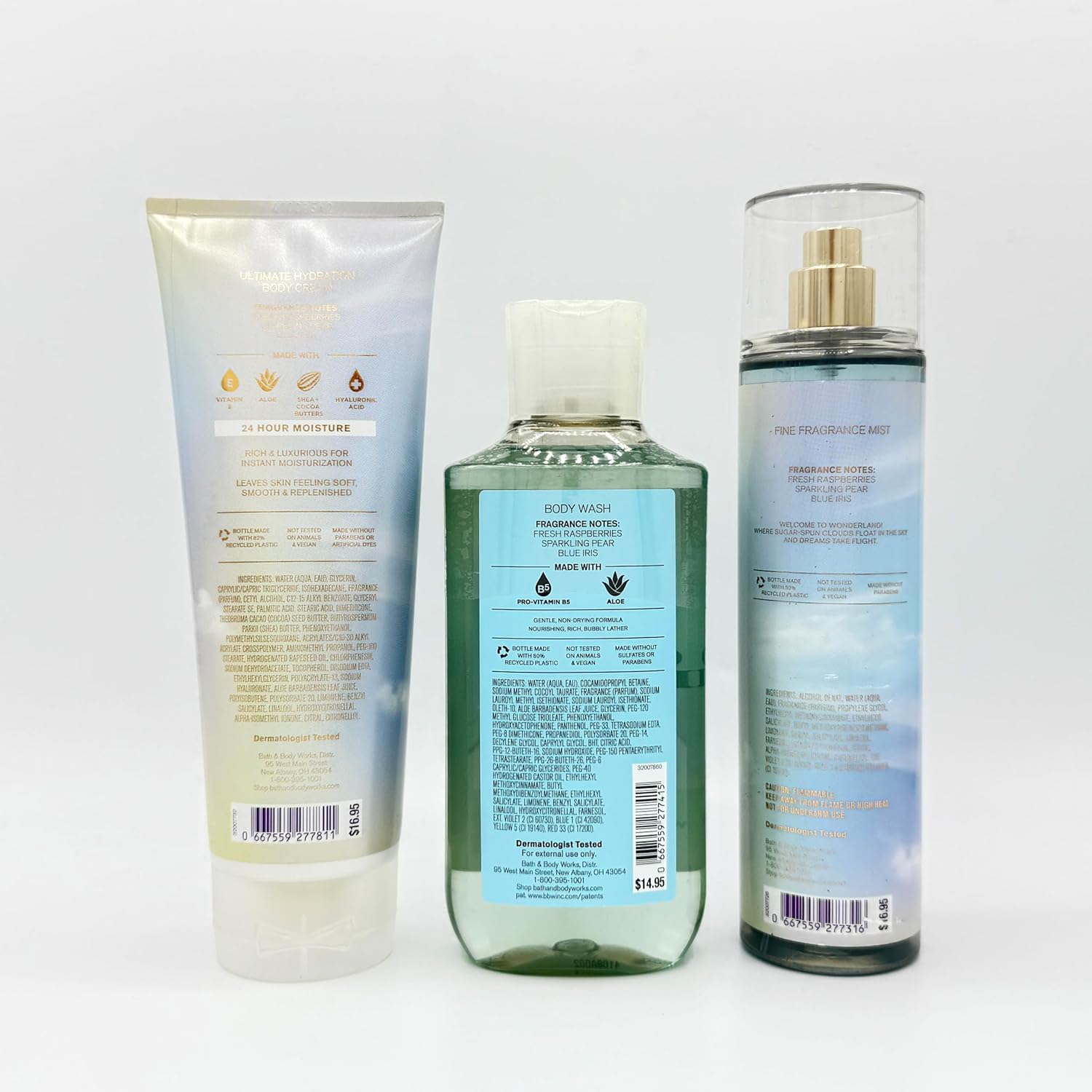 Confetti Daydream 3-Piece Bath Bundle | Ultimate Hydration Body Cream, Body Wash and Fine Fragrance Mist. Sizes: 10oz body wash, 8oz cream, 8oz mist. Scent notes: Fresh Raspberries, Sparkling Pear, Blue Iris. Contains: Pro-Vitamin B5, Aloe, Vitamin E, Shea Butter, Cocoa Butter, Hyaluronic Acid. Cleanses, moisturizes and nourishes the skin leaving a wonderful scent.