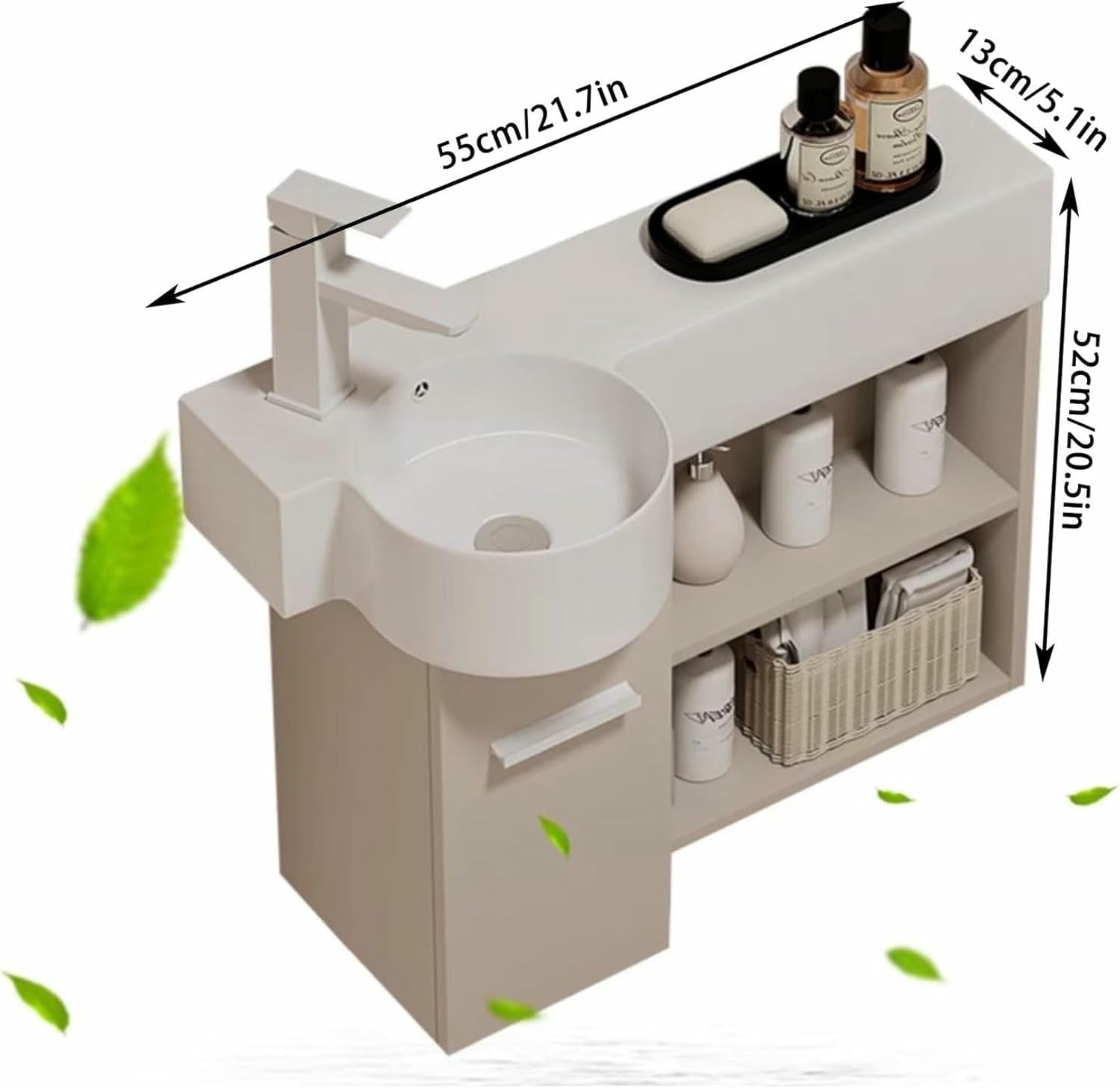 This L - shaped vanity fits snugly into bathroom corners, transforming unused nooks into functional washing and storage areas. Ideal for small bathrooms or compact layouts, it doesn’t take up aisle space, keeping your bathroom neat and well - organized.The vanity provides multi - level storage: the countertop holds daily toiletries, open shelves organize bottles and towels, and the cabinet door conceals clutter. It meets various storage needs, from daily washing essentials to bulk supplies, keeping your sink area tidy.With a clean color scheme and sleek lines, this vanity suits modern minimalist, cream - themed, and other bathroom styles. Whether you’re renovating a new home or updating an old bathroom, it blends in well and enhances the overall aesthetic.Product Name: Corner Bathroom Sink with Storage CabinetSize:55*52*13cm/21.7*20.5*5.1in70*52*13cm/27.6*20.5*5.1in80*52*13cm/31.5*20.5*5.1inColor: BeigeMaterial: CeramicStyle: Simple and ModernNote: Since the product size is measured manually, there will be some errors in the actual size. There may be slight color differences due to differences in monitors and resolutions. If you encounter any problems when receiving the package, please contact us.