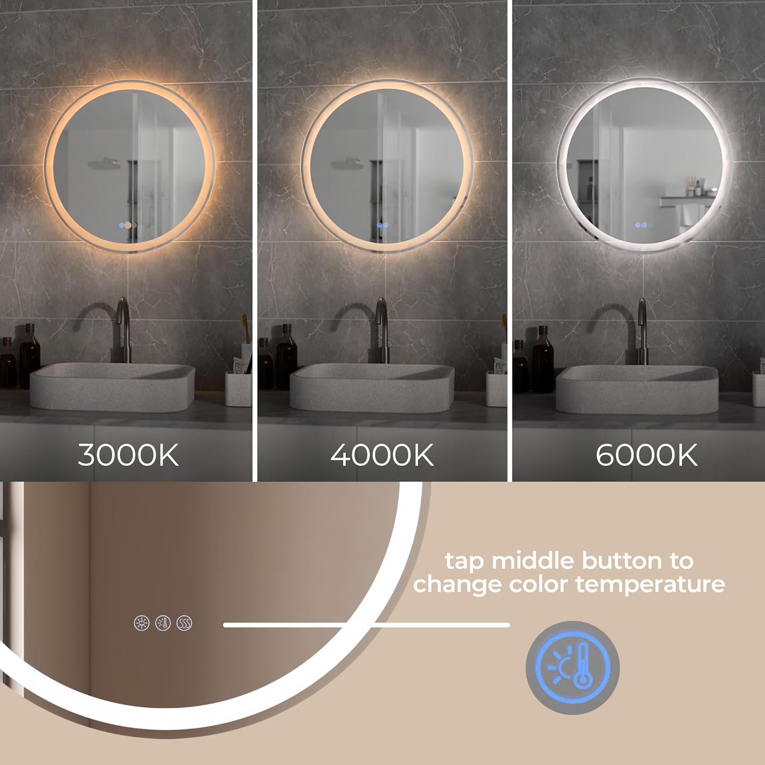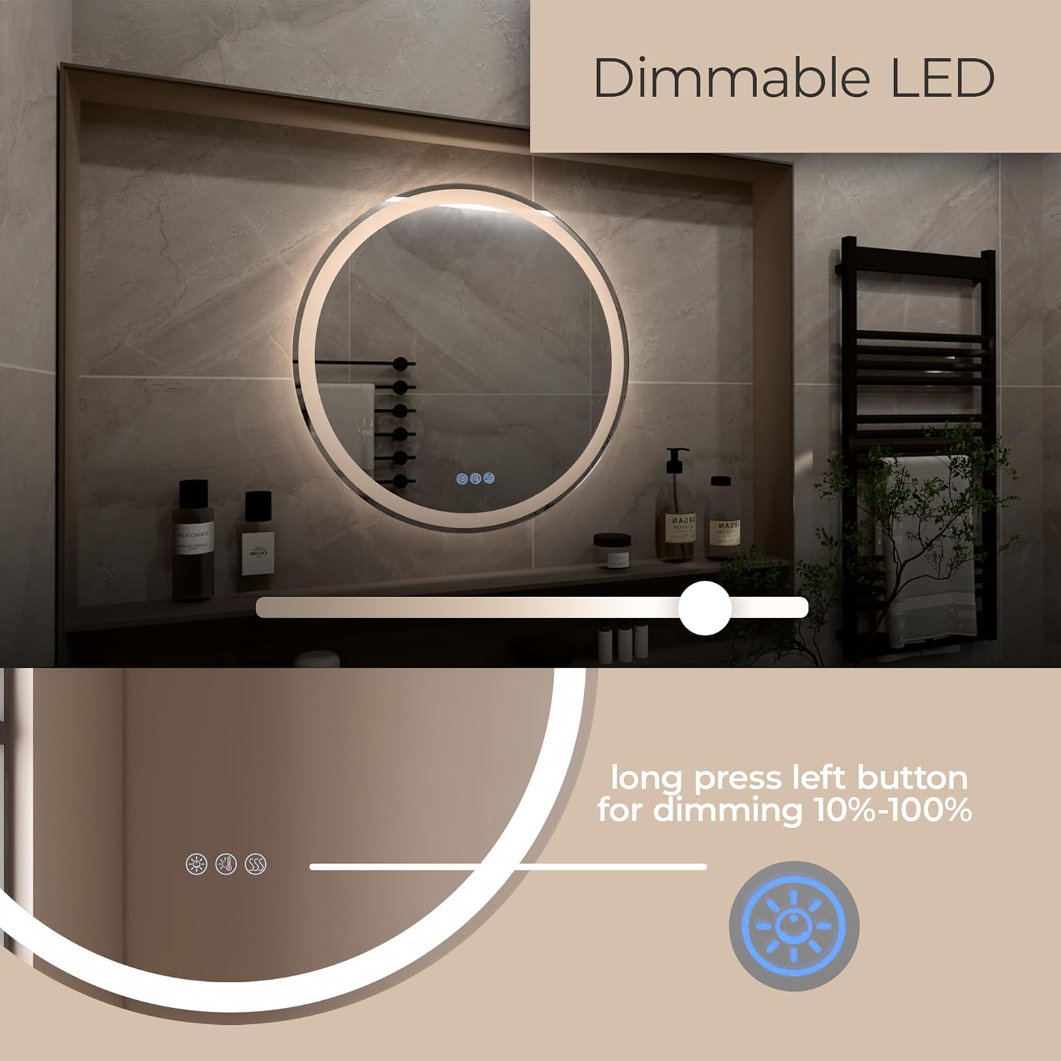 | Additional Features | Built-in de-fogger for bathrooms and high humidity areas., CCT Color Temperature Selectability 3-Step 2700K-3500K-6000K or hold for in-between., High-quality lead-free, copper-free and corrosion-resistant glass with silver coating., ON/OFF + dimming all-in-one button 100% to 5% dimming., Seamless installation with cleat and mounting hardware included. |
