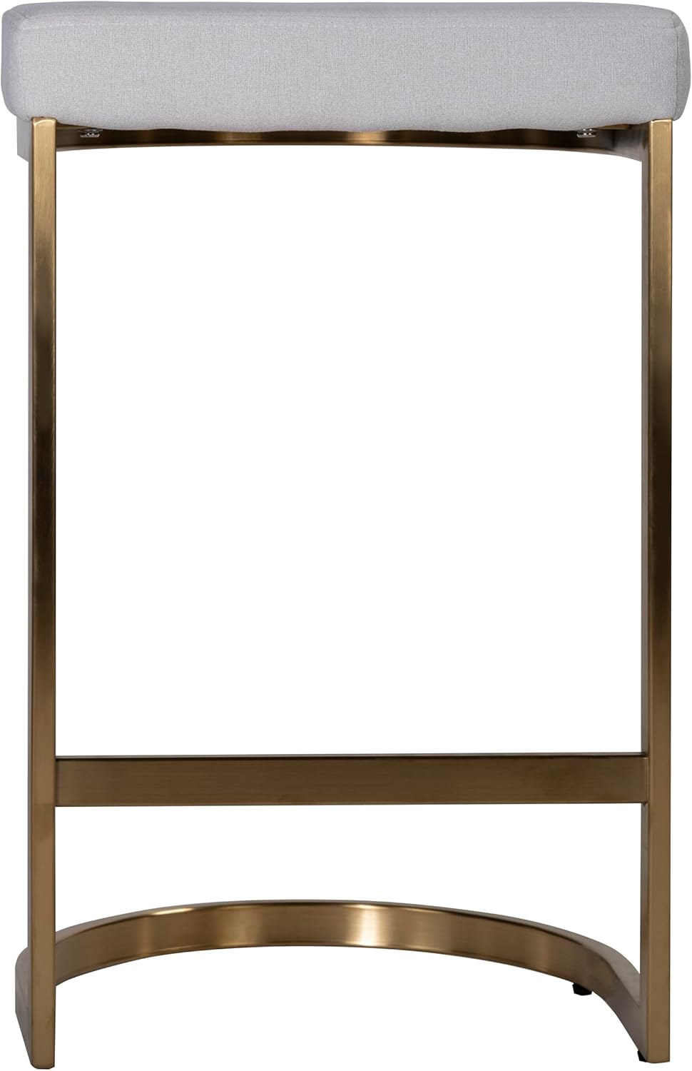 The Elon Halfmoon Counter Stool combines modern and classic elements for a stylish and comfortable seating solution. The brushed gold stainless steel frame is sturdy and stylish, while the soft ivory fabric upholstery provides a luxurious look and feel. The metal leg rest ensures comfort and stability, making this counter stool perfect for any dining space. The contemporary design and neutral tones make this counter stool a great choice for any home.