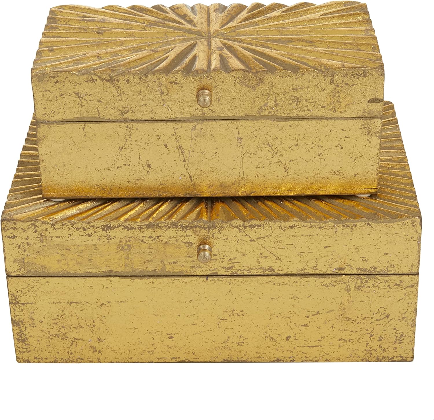 A practical yet stylish upgrade that instantly elevate the look of your room. Perfect way to add depth and texture to your surface space with this compact and discreet box. Whether displayed on your side table, coffee table or vanity area, this geometric set of 2 decorative keepsake boxes add a stylish touch to any space. Designed with felt or rubber stoppers at the base that prevent scratching furniture and table tops, as well as sliding around. This item ships in 1 carton. Wood box makes a great gift for any occasion. Suitable for indoor use only. This item ships fully assembled in one piece. Made in India. This gold colored wood decorative keepsake box comes as a set of 2. Contemporary style.