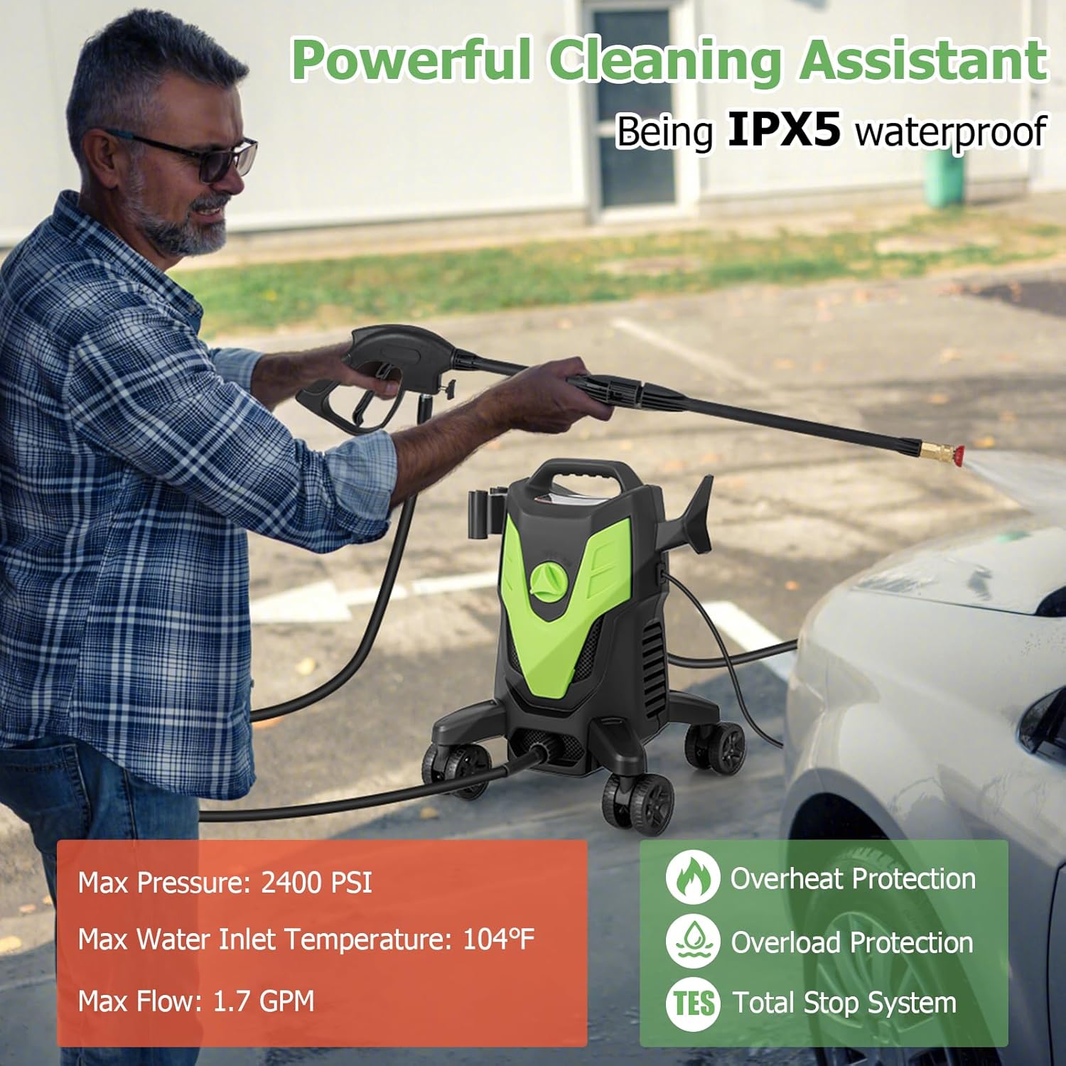 DescriptionThe IPX5 high-pressure washer offers a powerful pressure of 2400 PSI and a high flow of 1.7 GPM. With a 19.7 ft hose and a 16.4 ft power cord, it offers a large activity area, while its 4 universal wheels will ensure great stability and keep up with your actions. Plus, the cleaner has 4 nozzles to adjust water pressure for stubborn stains, for stone surfaces, for wood surfaces, and for glass surfaces. A soap bottle is included for easy application of detergent. Safety features such as overheating and overload protection, along with an automatic TSS system that shuts off the machine when not in use. The high power washer supports different water intake method such as faucet or bucket self-priming , allowing for quick start-ups. Also, it boasts 3 brackets for tidy storage. By the way, its maximum water inlet temperature is 104℉.FeatureCan always follow you and keep up with your actions Easy moving & large activity area enable you to clean every cornerComes with 4 nozzles for different needs, including 0°, 15°, 25° and 40°Support the convenient self-priming for different situationsFeatures 4 ABS universal wheels that are wear-proof and stableBeing IPX5 waterproof to become your powerful cleaning assistantOverheat protection, overload protection and total stop system for high security3 storage brackets to avoid messes, for gun & extended wand, hose, soap bottle, etcDesigned with a carrying handle, which allows for easy portabilityThanks to the rotation switch, the cleaner allows for easy operationWith metal connections, making it easy to install and leak-proofIts safety handle with a lockable design to avoid accidentsSuitable for versatile use, for car washing, fence cleaning or floor cleaningSpecificationColor: Green+Black/Orange+BlackMaterial: PP, ABS, MetalOverall Dimension: 12” x 11” x 16.5” (L x W x H)Length of High-Pressure Hose: 19.7 ftLength of Power Cord: 16.4 ftMax Pressure: 2400 PSIMax Water Inlet Temperature: 104℉Max Flow: 1.7 GPMVoltage: 120VFrequency: 60 HzNet Weight: 15.3 lbsPackage Includes:1 x High Pressure Washer4 x Nozzles1 x 0.14 Gal/500 ml Soap Bottle1 x Gun & Extended Wand1 x 19.7 ft/600 cm High-Pressure Hose1 x User Guide