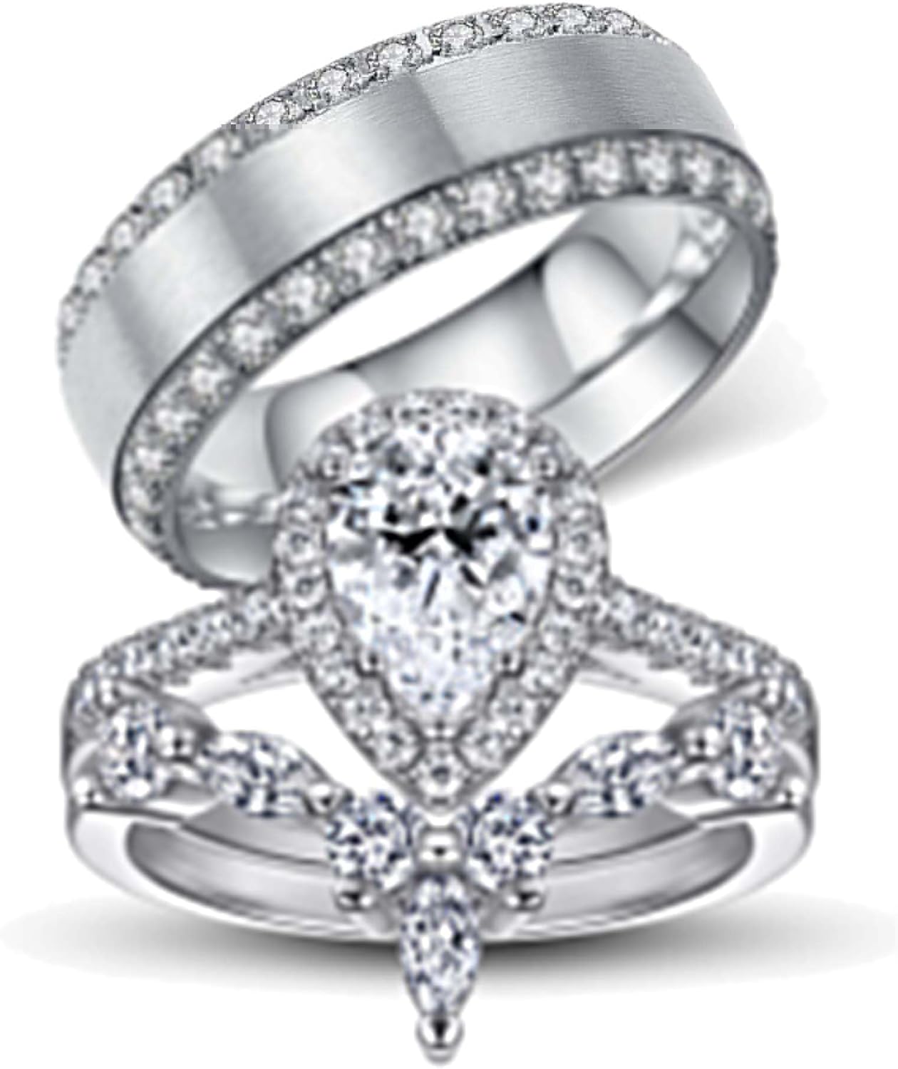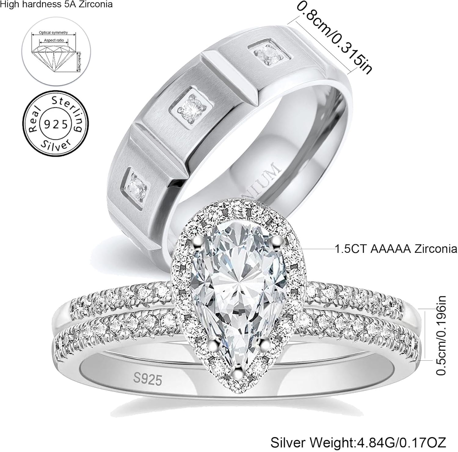 Womens ring is white gold plated 925 Sterling Silver with 1.5ct Pear cut AAAAA Zirconia mainstone,2pcs wedding ring sets,stamp:925.Mens ring is titanium wedding bands,8mm widt.2.5mm thick.stamp:titanium.Usage Scenario: These ringcrown Couple Rings are ideal for couples who want to commemorate their love in a meaningful and stylish way. Whether you are getting married, celebrating an anniversary, or simply want to show your commitment to each other, these rings are the perfect choice. Wear them as a daily reminder of your special bond, or save them for special occasions to make a statement. Let your love shine bright with these stunning rings. Ringcrown ring is not only beautiful, but also more safety and functionality.Its color is permanent,it is lead-free,nickel-free,safe to wear,allergy is eliminated.Inlay:Select qualified stone inlays,check the finished products one by one, and do anti-falling stone test,strictly control the problem of stone,rotten stone and dumb stone.1.The ring photos capture all the physical.1.The couple rings with a ring box.