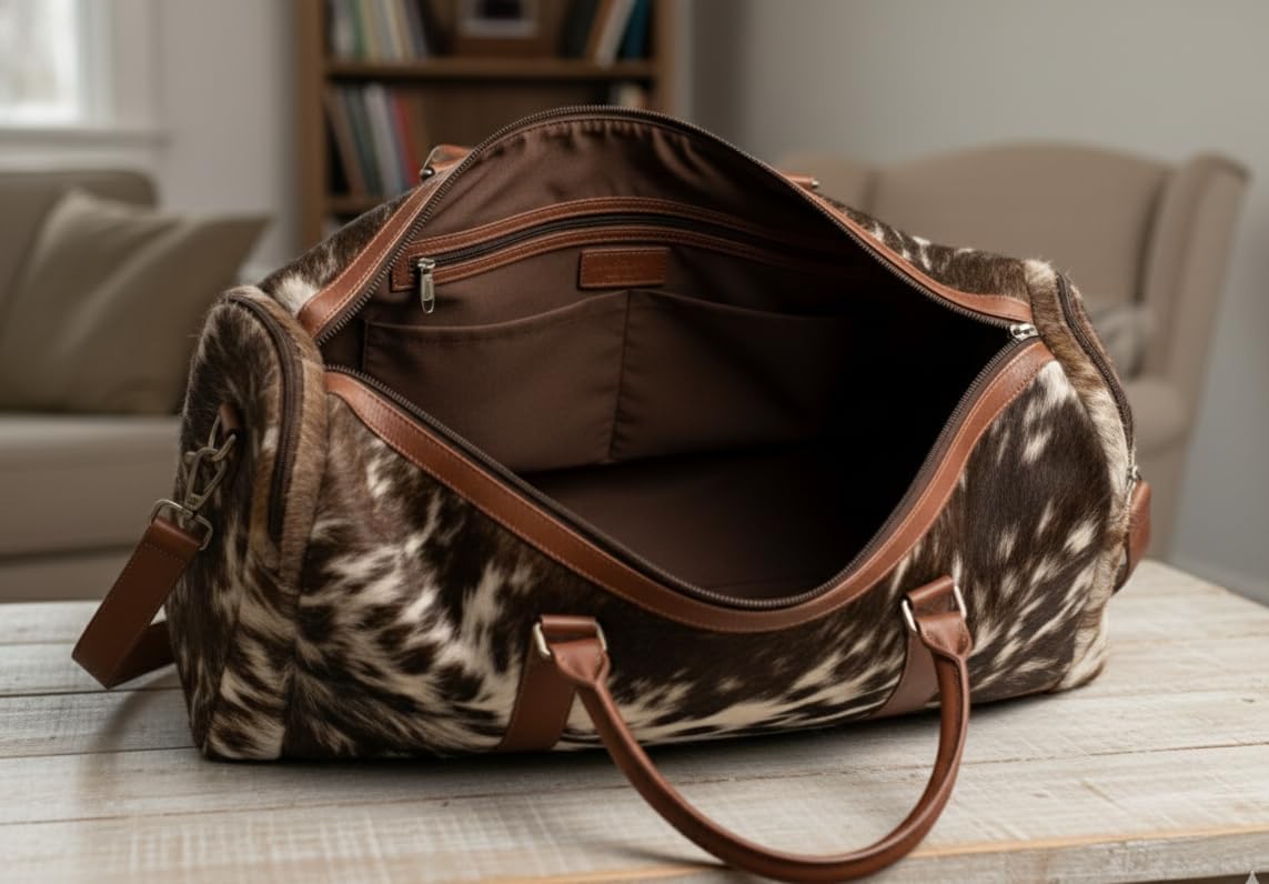 This weekender bag is hand-made from cowhide leather produced from natural tanning instead of harmful chemicals, which makes it long-lasting, eco-friendly, waterproof, & provides each bag a unique color with an earthy tone. Also, it has soft inner cotton lining, zippers, sturdy handles & an adjustable shoulder strap. SPACIOUS & STYLISH - This overnight bag sized 24"x12"x10" (LxWxH) contains a spacious main compartment sufficiently large for your clothes, shoes, travel, gym & sports gears which make it ideal for weekend getaways, short trips & outdoor activities. Also, it is a suited hand-luggage for airplanes. SATISFACTION ASSURED - All duffel bags are handmade and handcrafted with highly skilled artisans with care and attention to details to make it last for a lifetime. Your satisfaction is our top priority, so if you are not satisfied, we are not satisfied and that is why we offer a free 7 days return policy and 1 year international warranty As you know every animal prints are different from other pictures are for reference only you will receive similar color with different patterns or animal print patches.