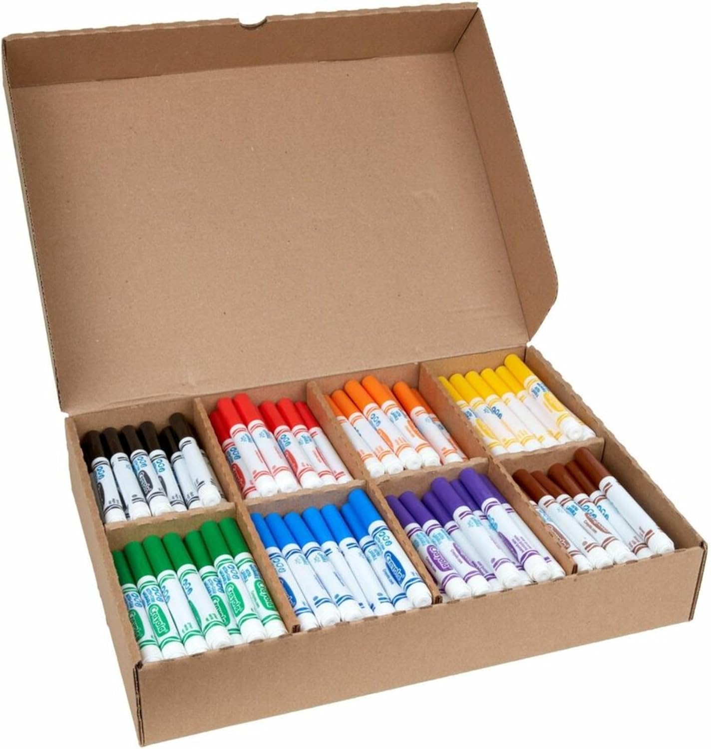 Product Description Kick off the school season with this colorful Crayola Classpack of 200 Ultra Clean Washable Markers. Featuring 8 assorted colors - Red, Brown, Violet, Orange, Yellow, Green, Blue, and Black - it's perfect for coloring sessions, homework assignments, and school projects. This pack isn't just for playtime, it brings practicality to classrooms. The broad line markers featuring a wedge tip encourage both thin and thick strokes necessary in young artists' projects. Plus, these markers are washable from most surfaces, putting teachers' minds at ease about any unintended doodles. The bulk pack of markers is a must have for classroom supplies with a smart storage design that separates each color to maintain tidiness. The Crayola Classpack is a blend of fun and organization, ideal for stimulating creativity and order in young minds. Stock up classrooms today! Safe and nontoxic, great for kids ages 3 and up. Crayola bulk school supplies are a must have for kindergarten, preschool, and elementary school classrooms and teachers. Perfect for creative learning all year long! From the Manufacturer Crayola 200ct. Washable Markers Classpack Conical Tip