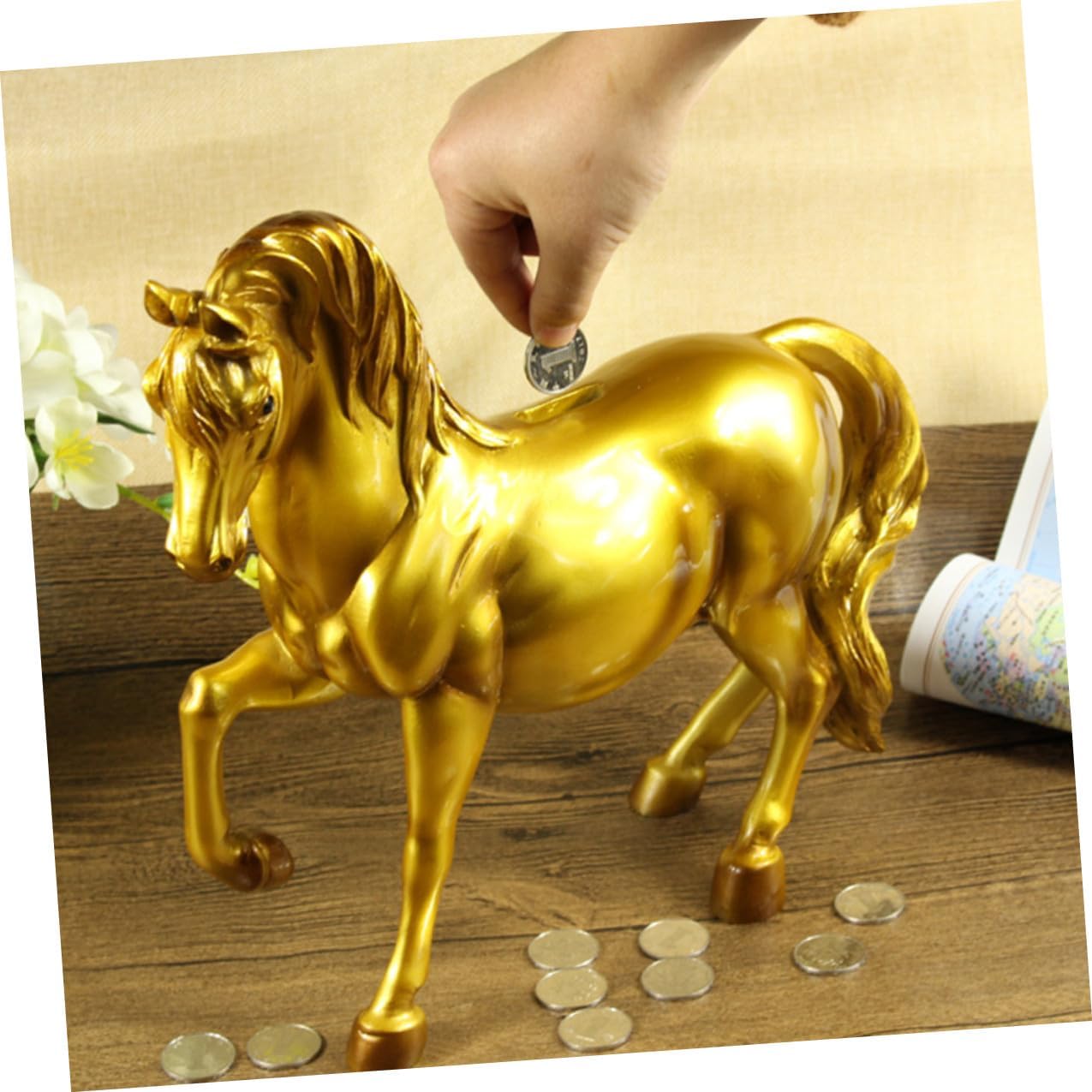 Package Include 1 pot Features -Product Info:Piggy bank decoration - Size: About 10x29.5x31.5cm coin jar. - Color: Golden horse coin bank. - Material: Resin money bank. - Our money bank is perfect for any places coin jar. - Help you keep your spare changes, coins, and bills organized and easy to jar bank - Large enough to hold your daily saving coins, changes, bills, etc bank. - An way to help your develop saving habits coin bank. - Perfect as a birthday .Goods Descriptionbank for This money pot is made of , helping you keep your spare changes, coins, and bills organized and easy to for home, shop or office and more.coin bank Your little boys and will glad to receive this saving bank as a birthday