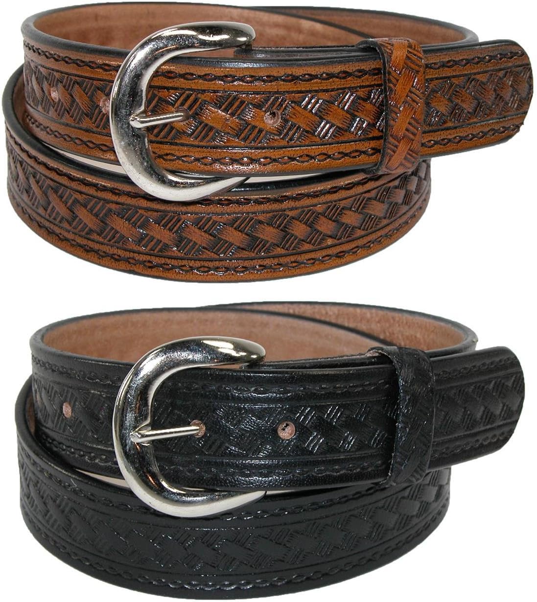 One belt has a basket weave embossing that adds a touch of western style. Measuring 1 3/8 inches wide this strap is mean for durability. The buckle is antiqued nickel, and can be removed easily to replace with your own buckle. When choosing a size, please take your pant size and go up one. For example, if you wear a size 34 in pants, buy a size 36 belt.