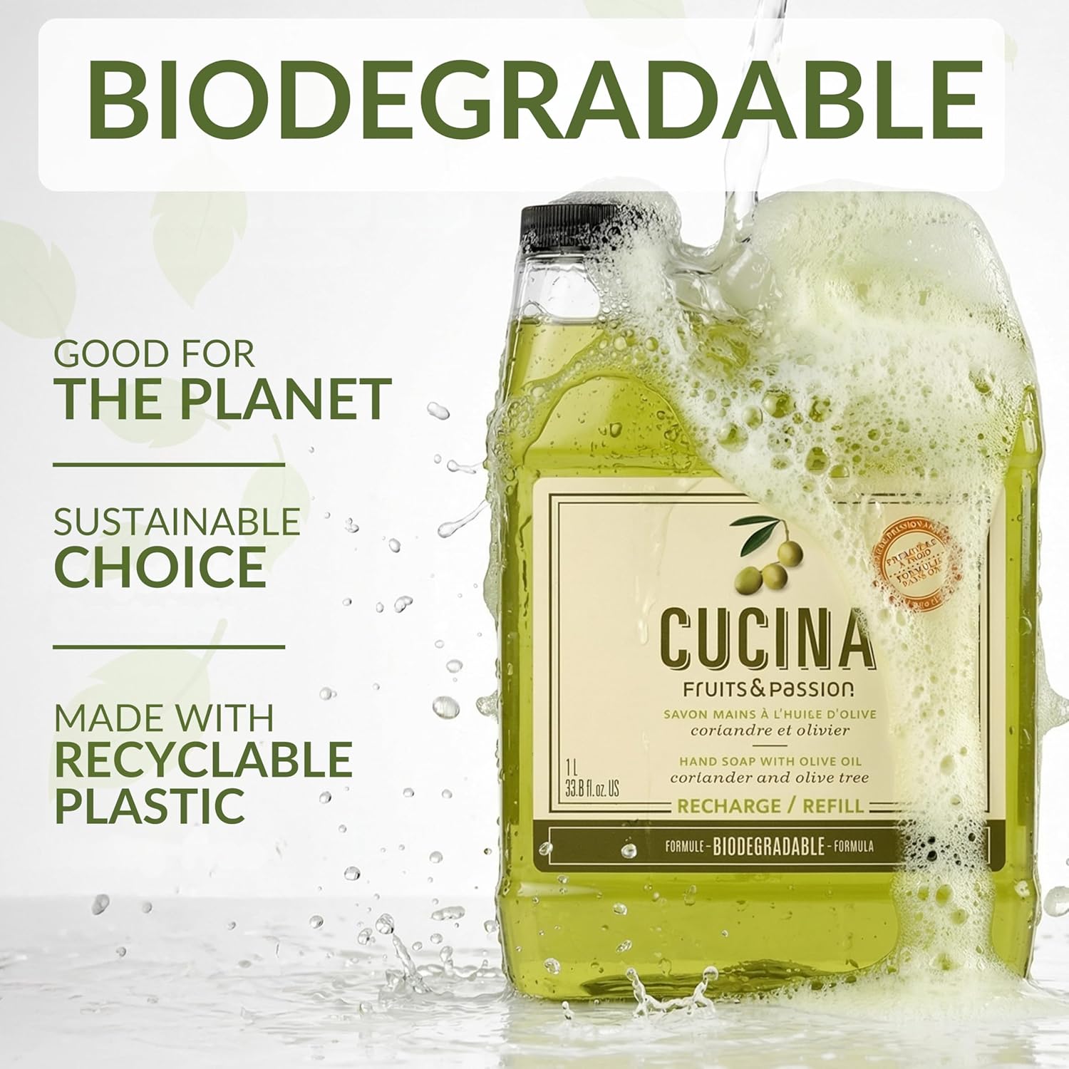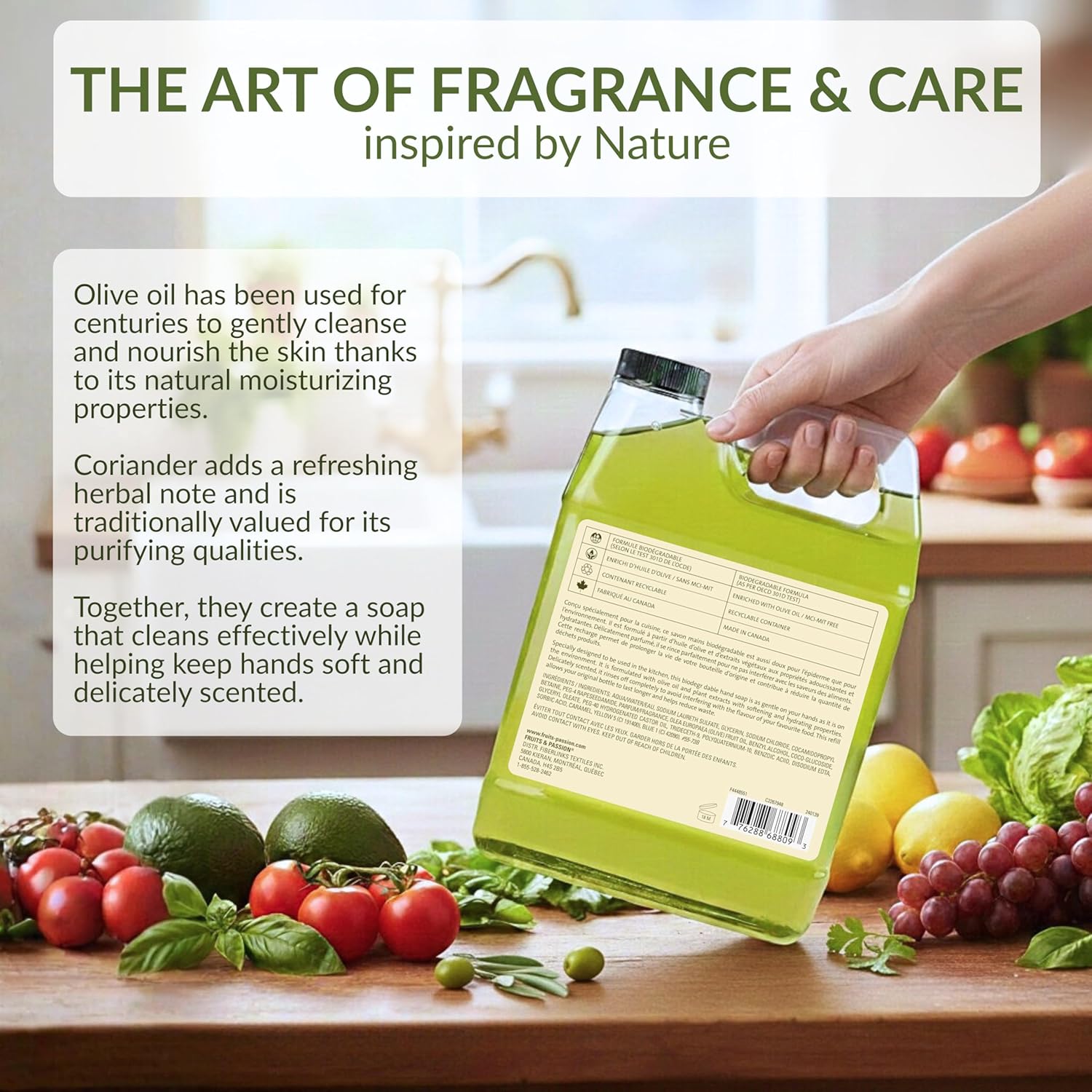 Designed for kitchen use, Cucina Fruits & Passion Coriander & Olive Tree Hand Soap Refill gently cleanses hands while helping maintain everyday comfort.Enriched with olive oil and plant-based ingredients, the formula rinses clean without leaving residue, making it ideal for frequent handwashing during cooking and meal preparation.The refined coriander and olive tree fragrance is subtle and balanced, designed to stay in the background without clashing with food aromas.This 1 liter (33.8 fl oz) refill helps extend the life of your original Cucina pump bottle while helping reduce packaging waste. The formula is biodegradable as per OECD 301D test standards, vegan, and made in Canada. Q: Is this hand soap suitable for kitchen use? A: Yes. It is formulated for the kitchen and rinses clean with a light fragrance that does not interfere with food aromas.Q: What does Coriander & Olive Tree smell like? A: It’s a refined, herbal scent with aromatic coriander seed notes and a subtle olive tree finish.Q: Is this a refill for the Cucina pump bottle? A: Yes. This 1-liter format is designed to refill and extend the life of your original Cucina hand soap bottle.Q: Is the formula vegan? A: Yes. It is made without animal-derived ingredients and is not tested on animals.Q: Is the container recyclable? A: The container is recyclable where facilities exist. Please check local recycling guidelines.Q: Where is this product made? A: It is made in Canada.