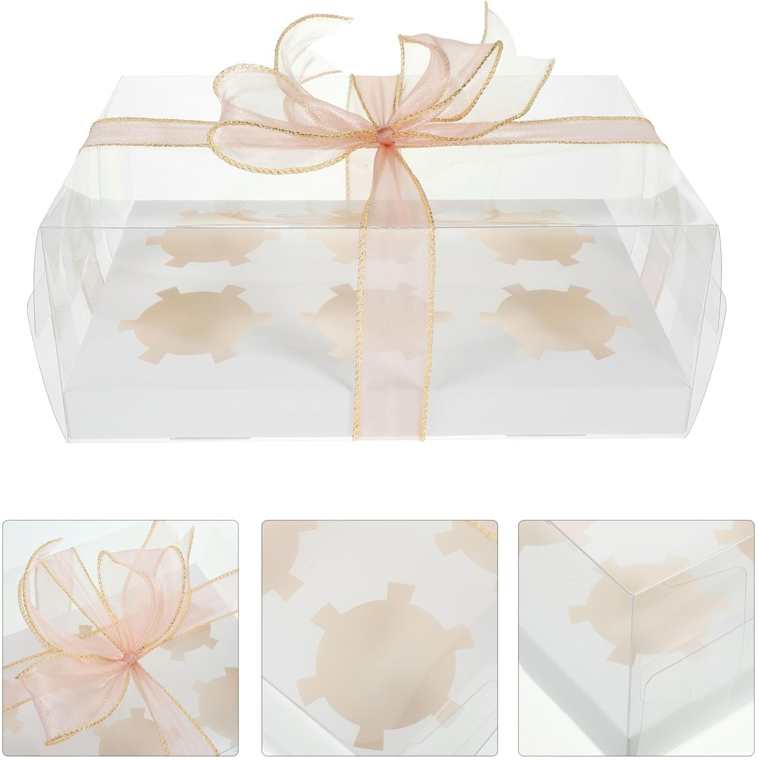 Package List 4 × Clear Packaging Boxes 4 ×6-hole Inserts 1 × Roll of Ribbon Characteristics -Product Info:Cupcake box -Material:PET, Paper, Polyester - Size: 26.00X18.00X14.00cm/10.22X7.07X5.50in - Portable Bakery Boxes are very suitable for bakery, grocery store, family use or catering clear cake boxes. - Easy to assemble, made from safe material, they are very sturdy and attractive, easy to use. - ColorTransparent - These boxes are perfect for shipping and packing donuts, and its compartments design can protect them well bakery pastry carrier boxes. - The clear lid allows the costumers to see the dessert in the box easily, to attract them to buy party food boxes. - Multipurpose, the bakery boxes can be used for packaging donuts, cupcakes, chocolates, breads and other bakeries pastry boxes.Goods InformationCake Packaging Boxes They are the perfect box to prepare some treats for guests at a party.Bakery Case This cupcake box is suitable for storing and packing cupcakes! Using good material, healthy and safe.Pastries Boxes They are sturdy yet lightweight and easy to travel with, safe for packing.bakery pastry carrier boxes They are great for storing cupcakes, donuts, biscuits, and other bakeries