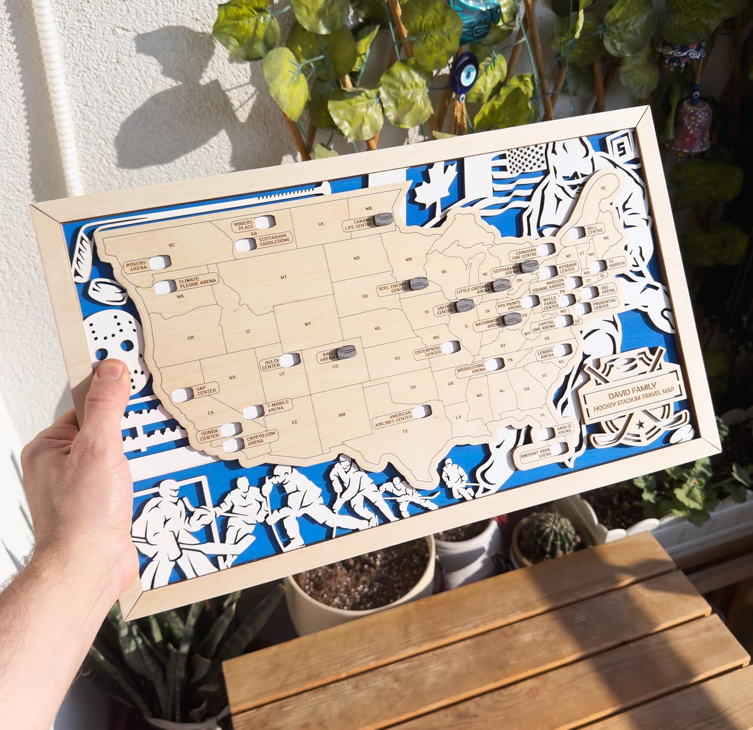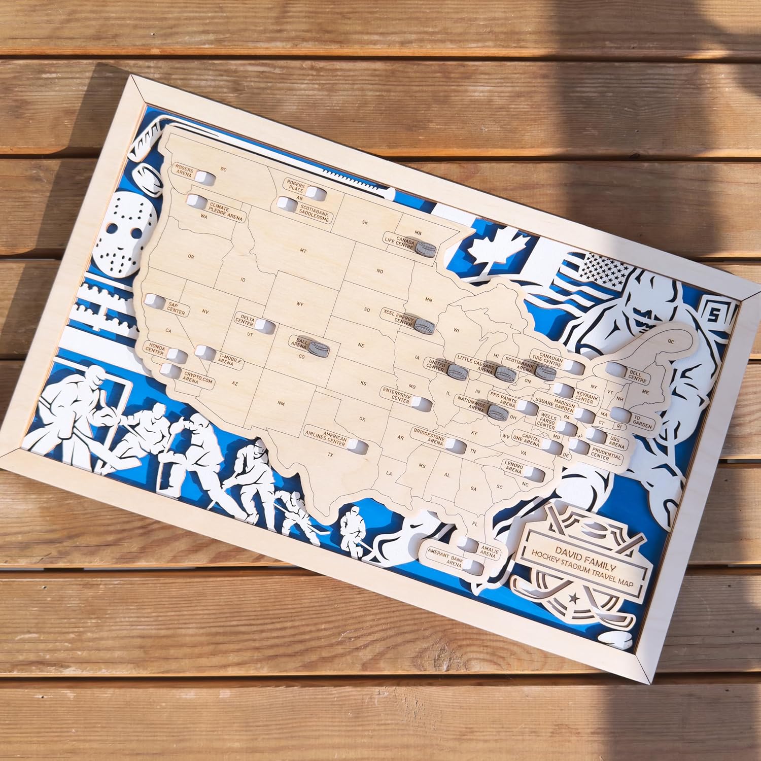 🥅 Personalized Wooden Hockey Stadium Tracker MapHandcrafted Wall Art for Hockey Fans 🥅Showcase your passion for hockey with this beautifully crafted wooden stadium tracker map. Mark your visits to iconic arenas across the U.S. and cherish the memories of every match. Designed to blend practicality with artistry, it’s a timeless piece for hockey fans. Whether displayed in your home, office, or given as a heartfelt gift, it’s sure to leave a lasting impression.⚙️ Features:・Material: High-quality Baltic Birch Wood・Dimensions: 11x18" or 16x26"・3 Layers of 1/8" birch plywood for depth and durability・18 color options for the bottom layer and 3 elegant frame colors to suit your style📦 What’s Included:・Wooden map・Hockey-shaped inserts with double-sided adhesive tape・Woven pouch with drawstring for insert storage・Easel for tabletop display・Wall-hanging fixture (pre-installed)Why Choose Our Shop?Exquisite Craftsmanship: Every piece is 100% handcrafted with attention to detail, ensuring a high-quality product.