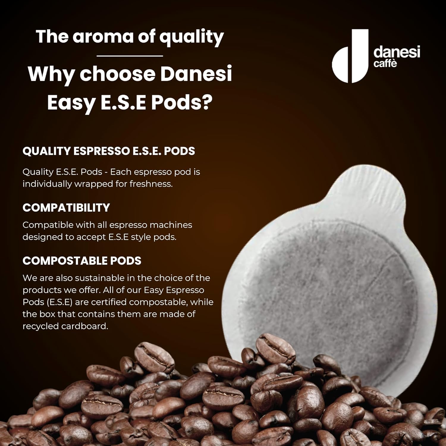 Experience a mellow and delicious cup of espresso right at the heart of your home with the Danesi E.S.E. Coffee Pods! Genuine, elegant, and loaded with citrusy and chocolate undertones, this coffee is a true reflection of our quest to bring together the roundness of the body, richness of flavor, and sweetness of taste. Each pod weighs 7.5g and can be used for ristretto and espresso. Our coffee capsules are compatible with Nespresso, Keurig, and Lavazza espresso machines (not affiliated). Pop one into your machine and enjoy a fresh cup of espresso any time of the day. For four generations, Danesi has been promoting the quality and culture of Italian espresso around the world. We look forward to our future by honoring our historic past and continuing to deliver excellence in every brew.
