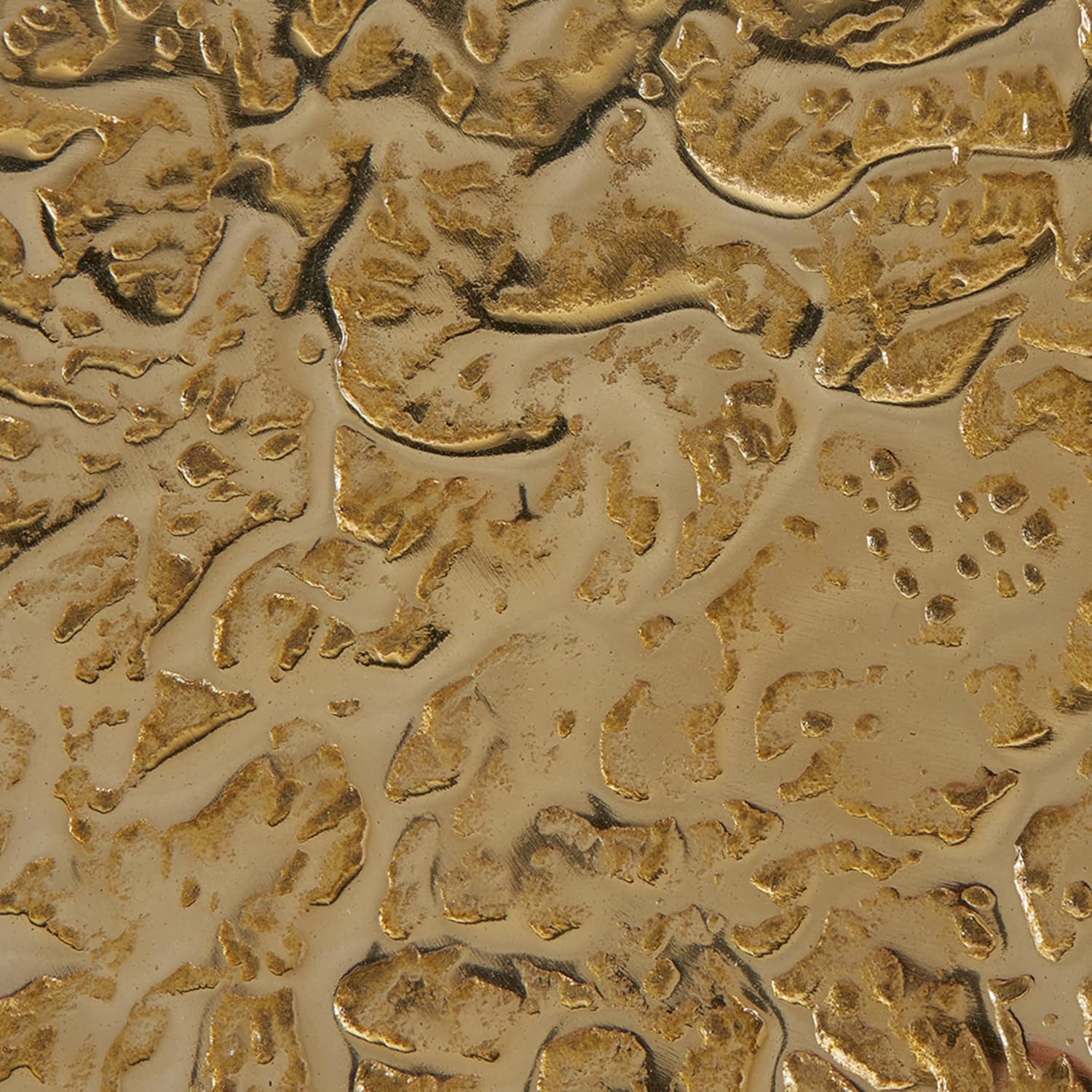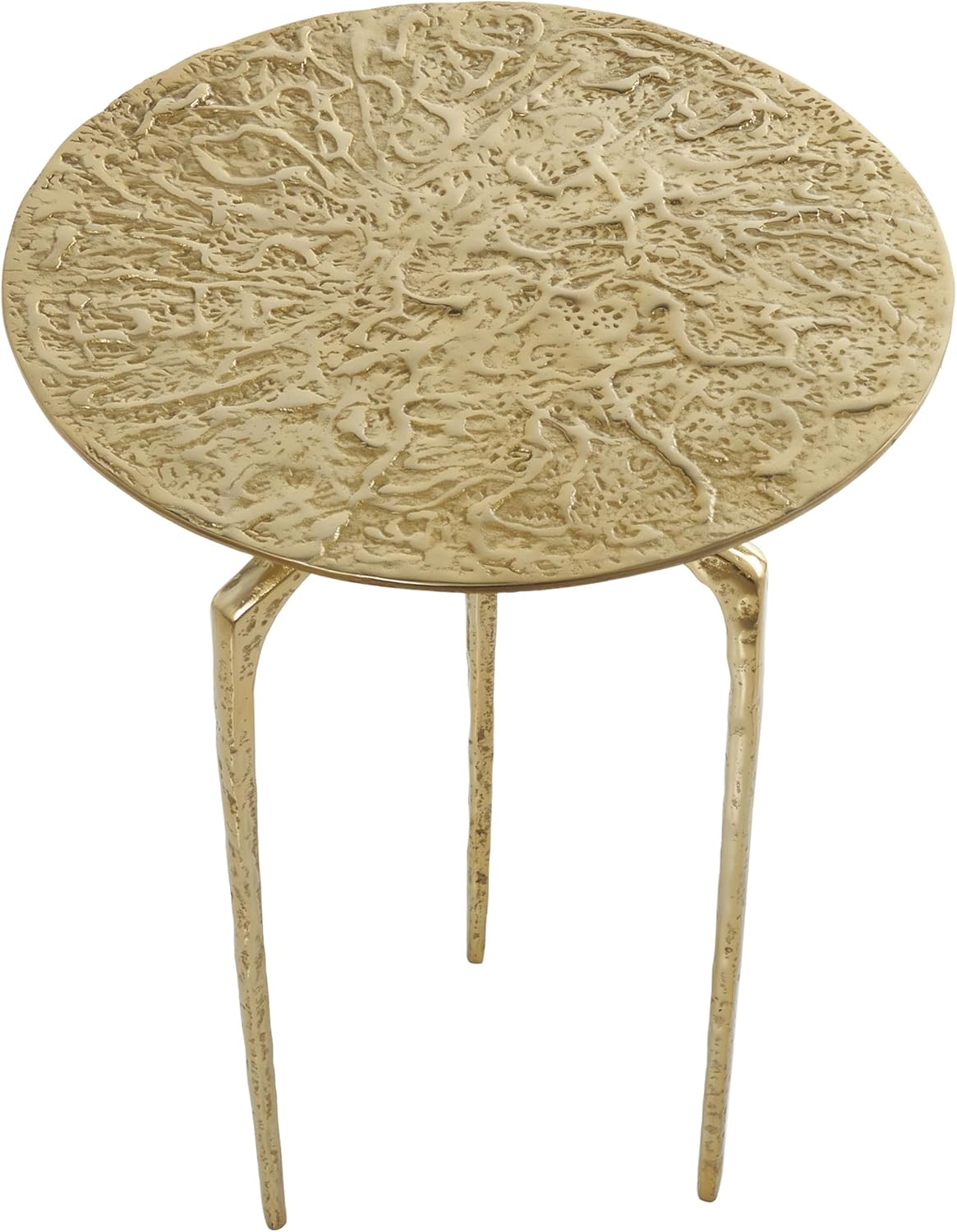 Meticulous attention to detail in adding the texture to the aluminum structure was used in crafting this modern small table, ensuring sturdiness and longevity for long-term use. Its round shape adds softness and an inviting touch to the overall aesthetic of the satin gold living room table, while its three legs enhance its modern appeal. Wipe clean with a dry cloth. The geometric end table can simply be placed next to a sofa or bed as a convenient surface for drinks, books, or decorative items. This item ships in 1 carton. Suitable for indoor use only. This item ships fully assembled in one piece. Maximum weight limit is 100 lbs. Made in India. This is a single gold colored end table. Modern style.