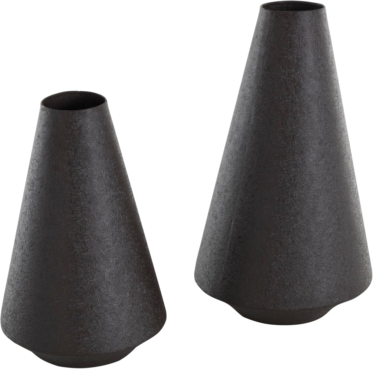 Place this conical metal vase 2-piece set as an elegant centerpiece on your dining table or in your living room, enhancing the beauty of your home decor. Designed with felt or rubber stoppers at the base that prevent scratching furniture and table tops, as well as sliding around. This item ships in 1 carton. Metal vase makes a great gift for any occasion. Suitable for indoor use only. This item ships fully assembled in one piece. Made in India. This black colored metal vase comes as a set of 2. Modern style. Vases have 2.50 in, and 2.40 in mouth openings.