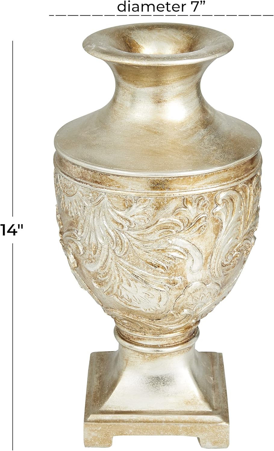 Display this Greek pot vase as a stand alone focal point piece on your entryway, living room, or carpeted hallways to achieve a rich historic vibe. Designed with felt or rubber stoppers at the base that prevent scratching furniture and table tops, as well as sliding around. This item ships in 1 carton. Suitable for indoor use only. This item ships fully assembled in one piece. This is a single gold colored vase. Traditional style. Vase has a 2 in mouth opening.
