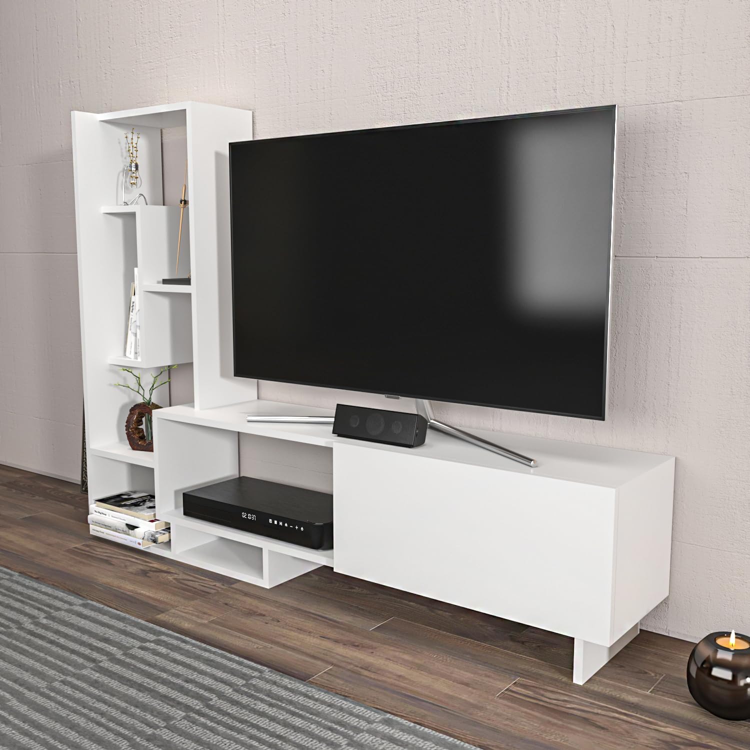 Whether stationed in your man-cave or put on display in your living room, media stands are always a great addition. Take this one for example: Crafted from 18mm thick quality manufactured wood, it features an array of open shelves that offer up some contemporary appeal, as well as provide a place to showcase favorite photographs, vases, and more. After assembly, it can support any television up to 55". Pega TV stand is a modern way of decorating your living room. It can also be used for decorative objects as well as storing books, DVDs