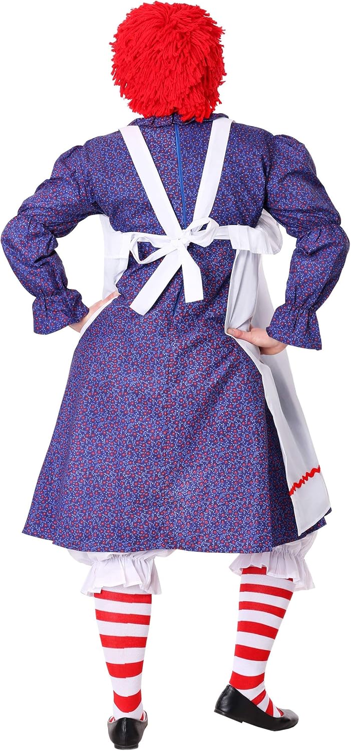 Step into the whimsical world of classic Halloween charm with our Deluxe Raggedy Doll Plus Size Costume for Women, the ultimate outfit for those looking to embrace their inner rag doll spirit this spooky season. This delightful ensemble features a nostalgic blue floral print calico dress with a convenient hook & loop fastener at the center back for easy wear, along with a playful ruffled collar and charming elastic detailing at the sleeve cuffs, evoking a sense of vintage raggedy doll charm. The pinafore apron, adorned with vibrant red rickrack trim at the hemline, adds a touch of whimsy to the outfit, complete with same-fabric waist ties for a comfortable and customizable fit. Crafted from premium quality materials including 100% polyester for the dress and 99% polyester with a hint of cotton for the apron and bloomers, this costume ensures both durability and comfort throughout your Halloween adventures. Perfect for those in search of a classic yet unique ensemble, this costume is available in various sizes, catering to a range of body types for a flattering and inclusive fit. Transform into a beloved childhood character with a modern twist and make a statement at any Halloween party with our Deluxe Raggedy Doll Costume. Add this timeless piece to your collection and bring a touch of whimsy to the festivities. - Dress - Apron - Bloomers - Wig - Pair of Socks