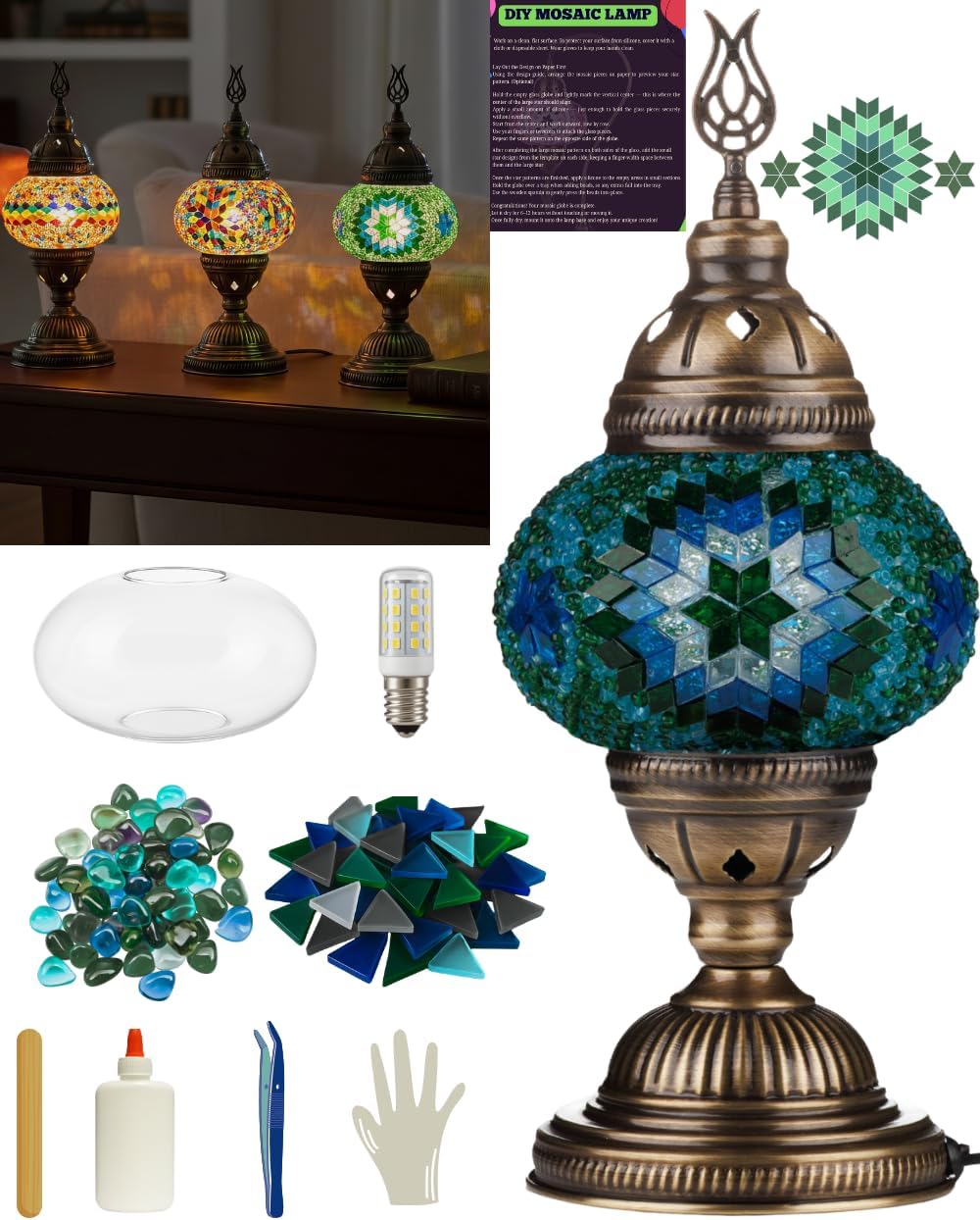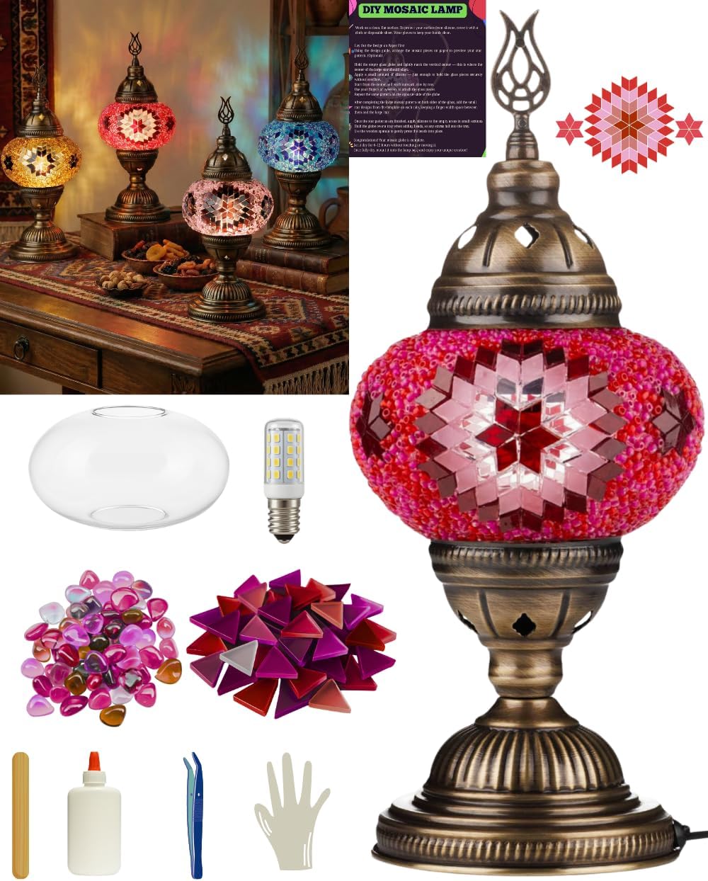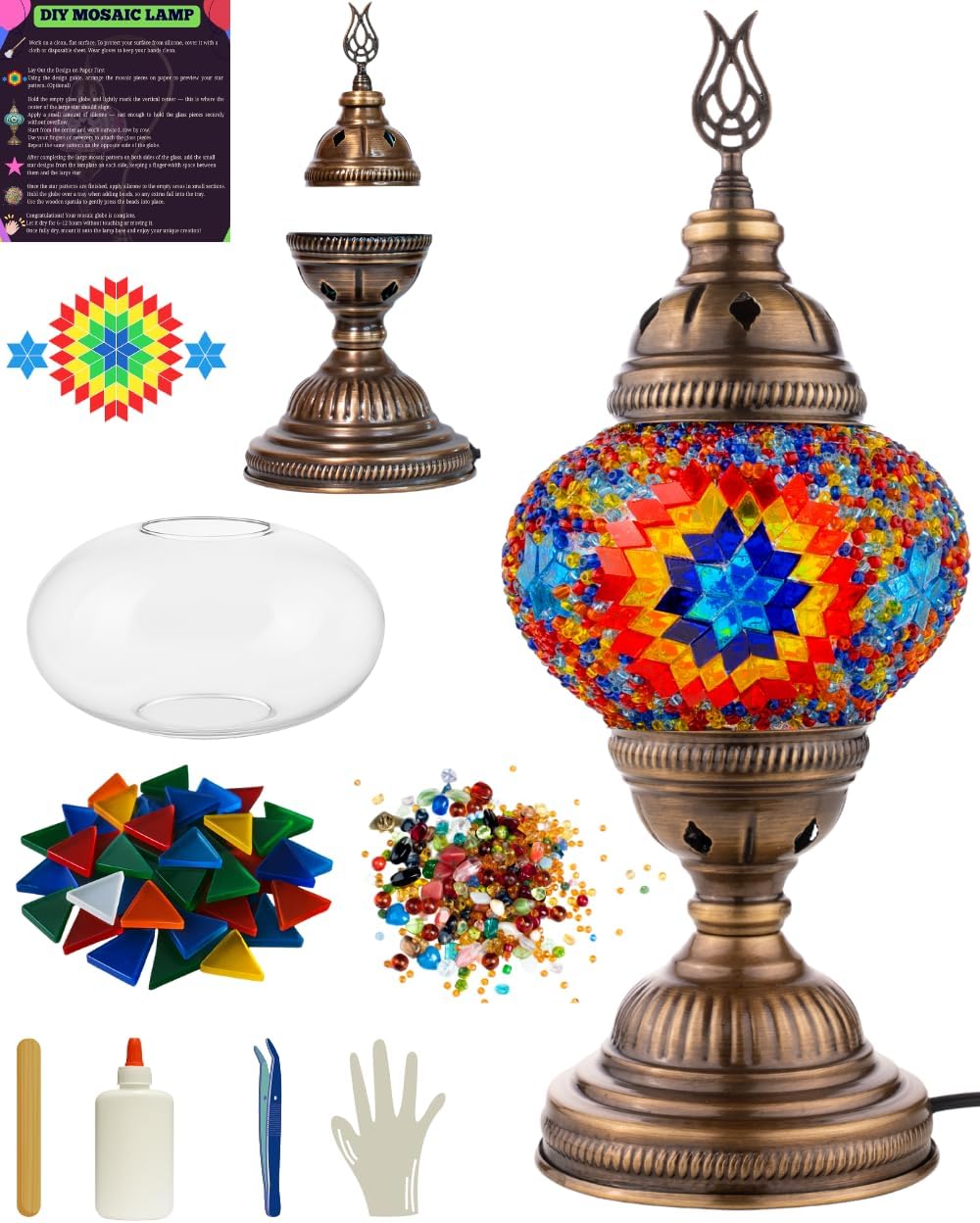Transform your space with this DIY Turkish mosaic table lamp kit that lets you create a stunning, personalized lighting masterpiece. The kit comes complete with everything needed: an elegant metal lamp body featuring an antique brass finish, a glass lampshade ready for your artistic touch, colorful mosaic glass pieces, decorative glass beads, and all the essential tools including silicone adhesive, tweezers, a spatula, and protective gloves. A design template is included to guide your creative process, making this project accessible for crafters of all skill levels. The lamp is compatible with any standard candelabra LED bulb, giving you the freedom to choose the brightness and color temperature that best suits your space. Perfect for adding a touch of Mediterranean charm to any room, each lamp becomes a unique piece of functional art. This engaging DIY project offers a wonderful way to express your creativity while creating a beautiful accent piece for your home.