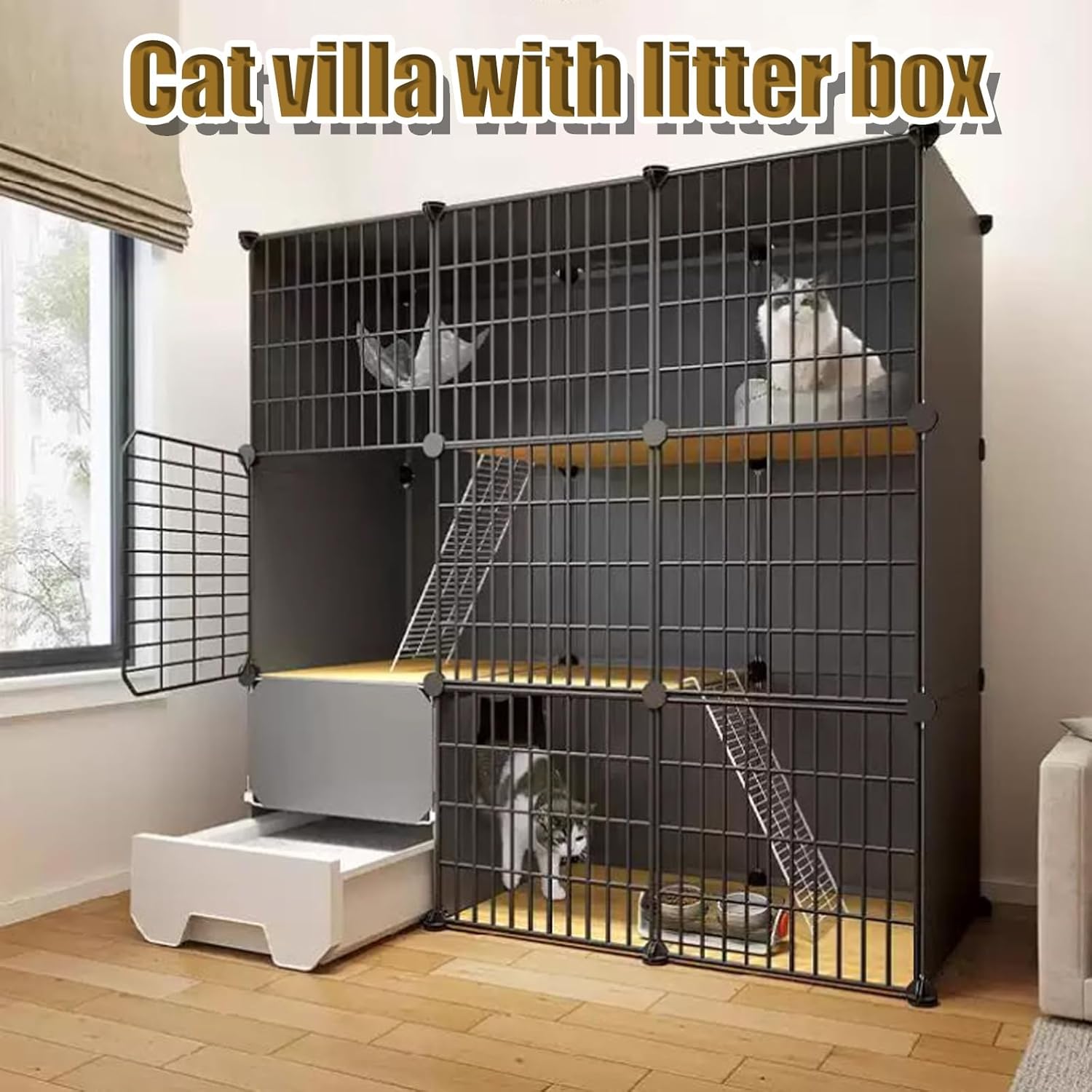 Welcome to our store! Discover the ultimate indoor cat carrier, thoughtfully designed to offer a secure, cozy, and enjoyable environment for your feline friend. This upgraded cat bed combines functionality with comfort, featuring a covered litter box and scoop that effectively minimize odors and messes. It's an ideal solution for pet owners looking to maintain a clean and fresh home while ensuring their cat's happiness. Crafted from durable metal and PP materials, this stylish cat cage is available in sleek black. We offer various dimensions to fit any space perfectly: 73*37*72cm (28.7*14.5*28.3in) with 2 rows and 2 tiers, 73*37*107cm (28.7*14.5*42.1in) with 2 rows and 3 tiers, 107*37*72cm (42.1*14.5*28.3in) with 3 rows and 2 tiers, 107*37*107cm (42.1*14.5*42.1in) with 3 rows and 3 tiers, and 143*37*107cm (56.2*14.5*42.1in) with 3 rows and 3 tiers. This versatile cat cage is perfect for use in bedrooms, living rooms, or even outdoor spaces, allowing your cat to feel secure wherever they are. Each package includes one cat cage, and our dedicated customer service team is available 24/7 to assist with any inquiries. Experience the blend of style, comfort, and practicality with our cat carrier today!
