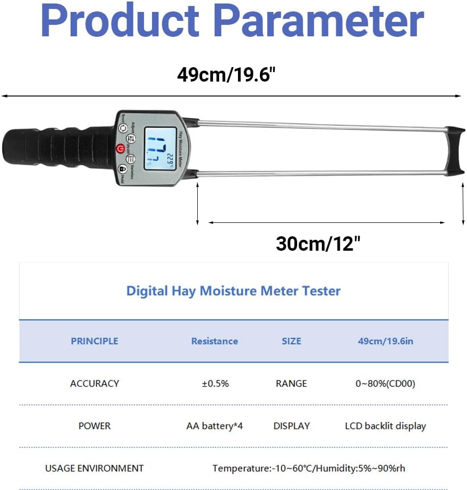 Specifications: Component: ABSBacklit: YESTesting Ranges: 0-80RHUsing Environment: -10 to 60℃, 5-90RHBattery: 4pcs 3A Battery Requires(NOT Include)Total Length: About. 49cm/19.29inPackage Includes: 1pc Digital Moisture MeterNote: Please allow 1-2cm errors due to manual measurement. Due to difference between different monitors, the picture may not reflect the item actual color.